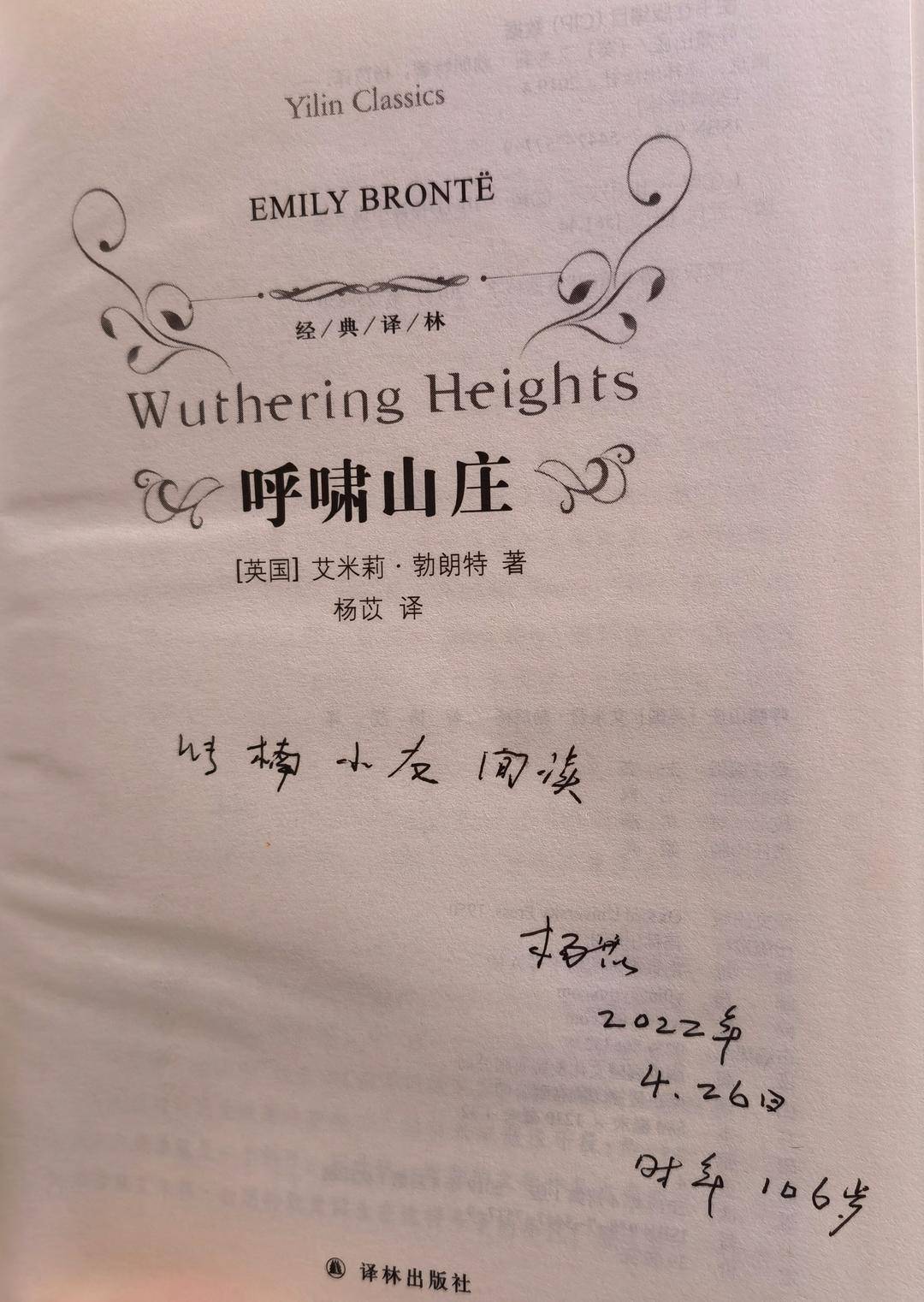 杨苡在送给记者的《呼啸山庄》译本的扉页上签名,写下时年106岁,把自己写大了三岁,但她说不改了,现在想来,其中或有忘掉年龄的任性不羁。有一种达观面对生死的看法说,不再去参加好友的追悼会了,“反正过不多久我们在那儿都能见到”,送走身边许多故交的杨苡也赞同这样的看法。1999年,84岁的赵瑞蕻病逝于南京;2009年杨宪益去世,终年94岁;2017年12月,杨敏如离世,享年102岁。她的同辈人在世的已所剩无几,因为长寿,她几乎看到了所有人的结局。“以前我参加都会哭,觉得不声不响又死掉一个,慢慢发现,我不会再哭了……”