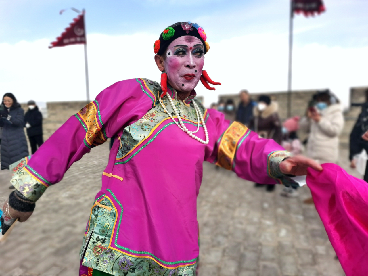 踩高跷、舞龙斗狮、划旱船、扭秧歌......各村社火队正在蔚州古城的古城墙上进行富有地域特色的民俗社火表演,十里八村的百姓闻讯赶来观看,更吸引了来自京津冀及周边地区的游客,不少游客同表演者斗舞互动,参与其中,热闹异常。
