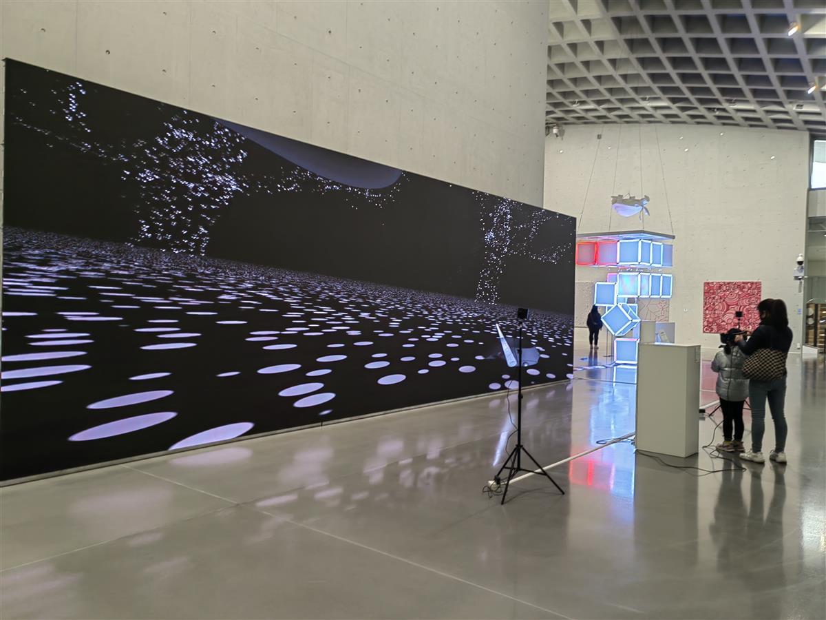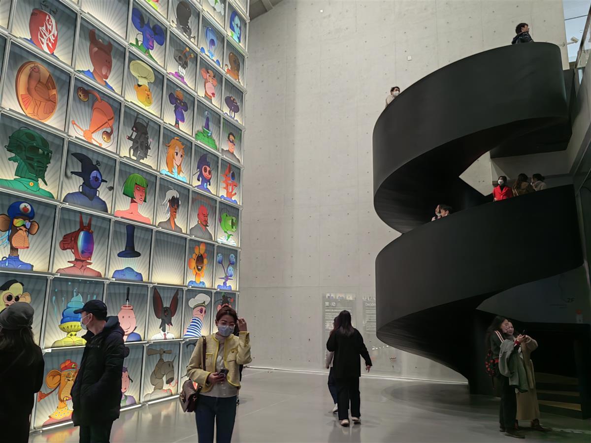 2月1日,正月十一,下午2点,极目新闻记者来到武汉美术馆(琴台馆),发现门口已有不少观众排队验证预约码进馆。该馆正在展出的武汉双年展的互动装置作品、新媒体作品、虚拟现实作品等,吸引了观众观赏和参与互动。