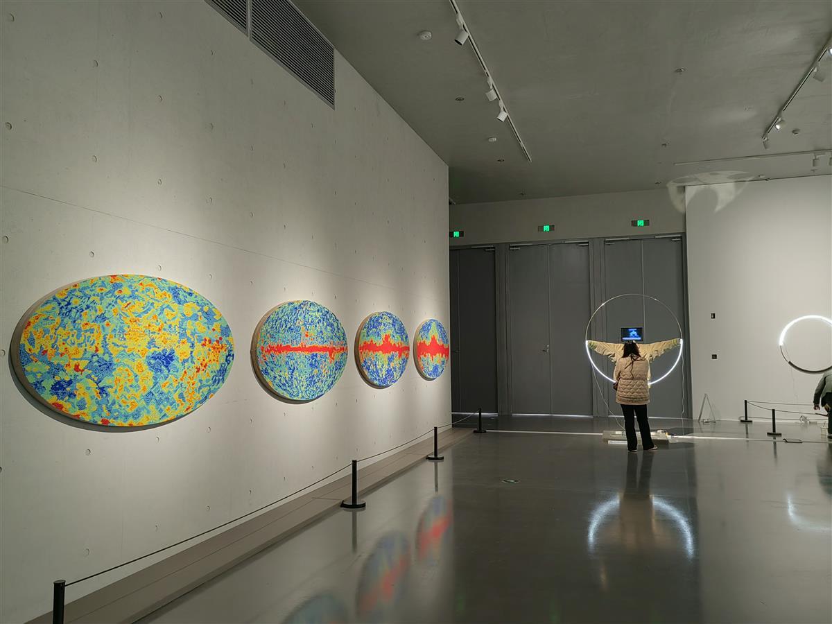 在展厅“网红打卡点”旋转楼梯附近,出自青年艺术家沈京京之手的作品《奇点》,引来了一批家长和孩子排队体验。