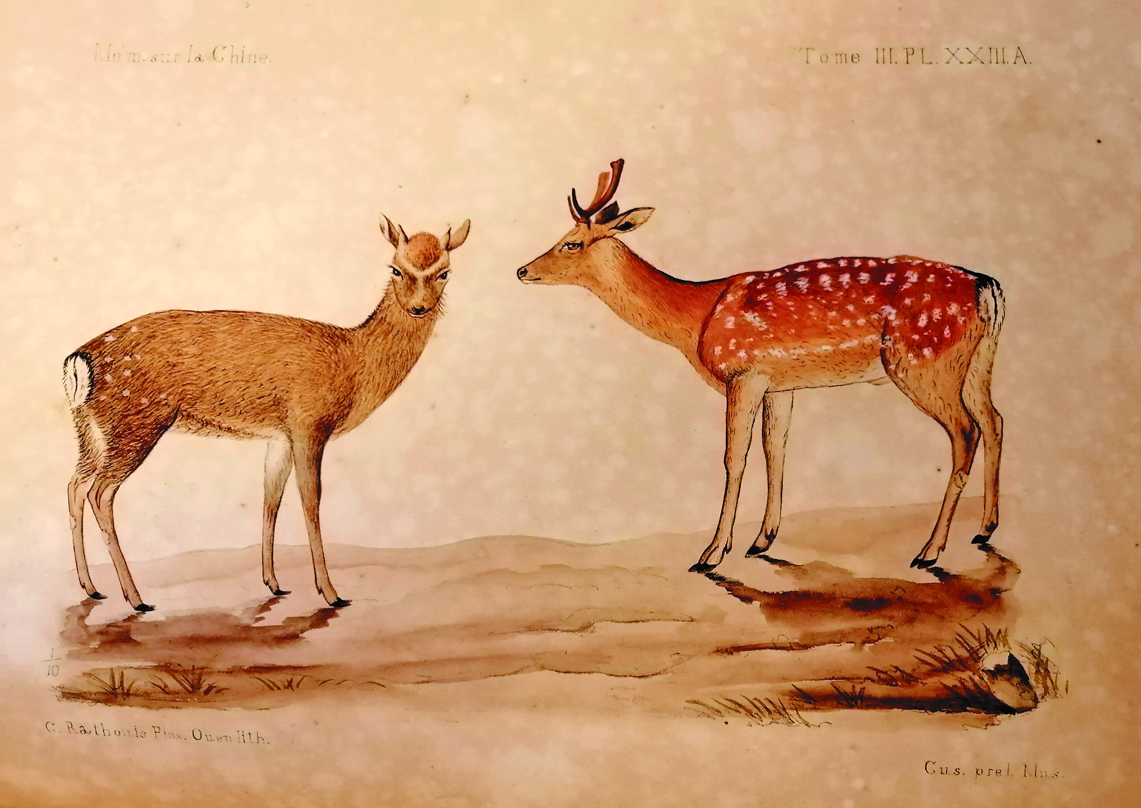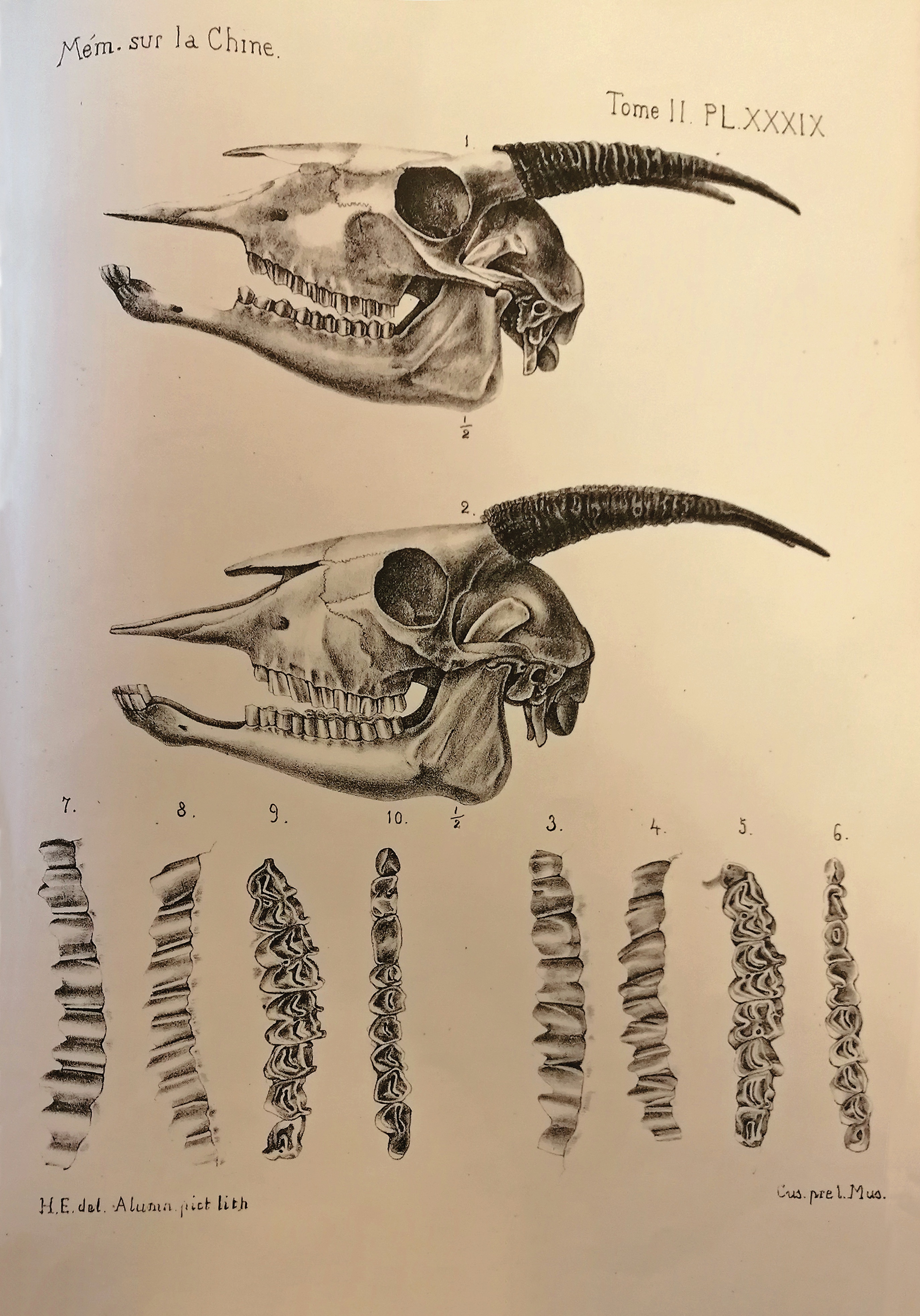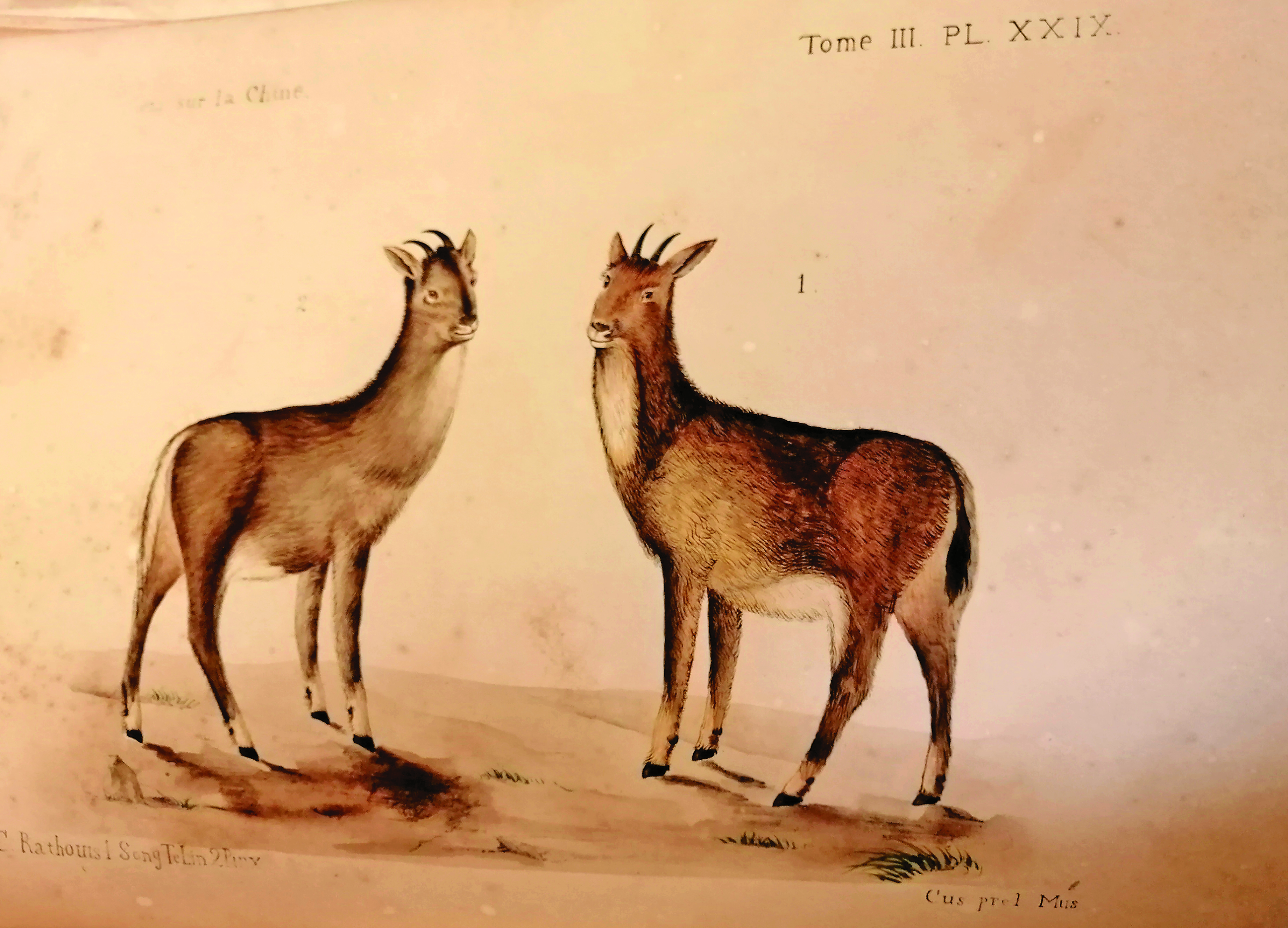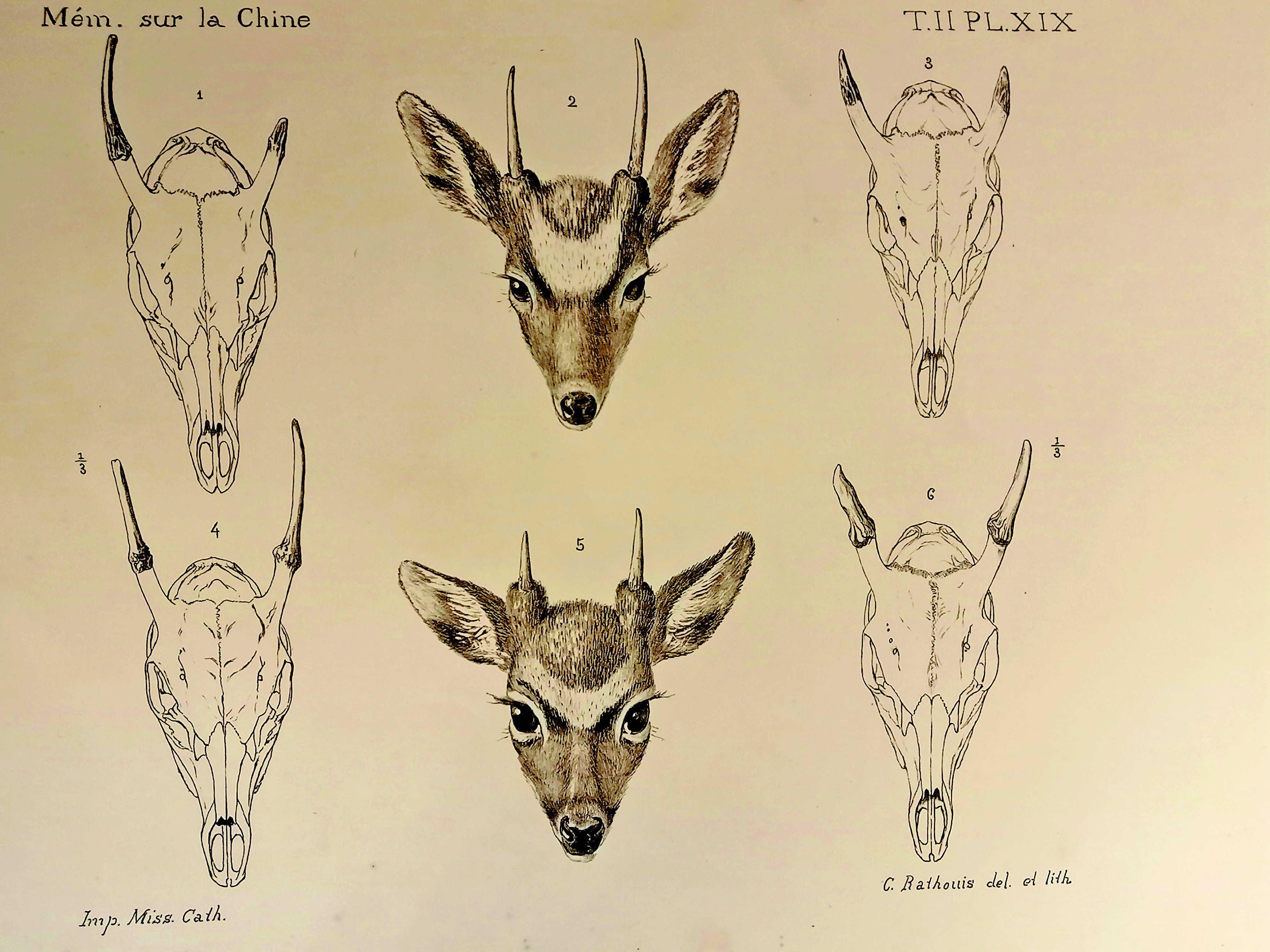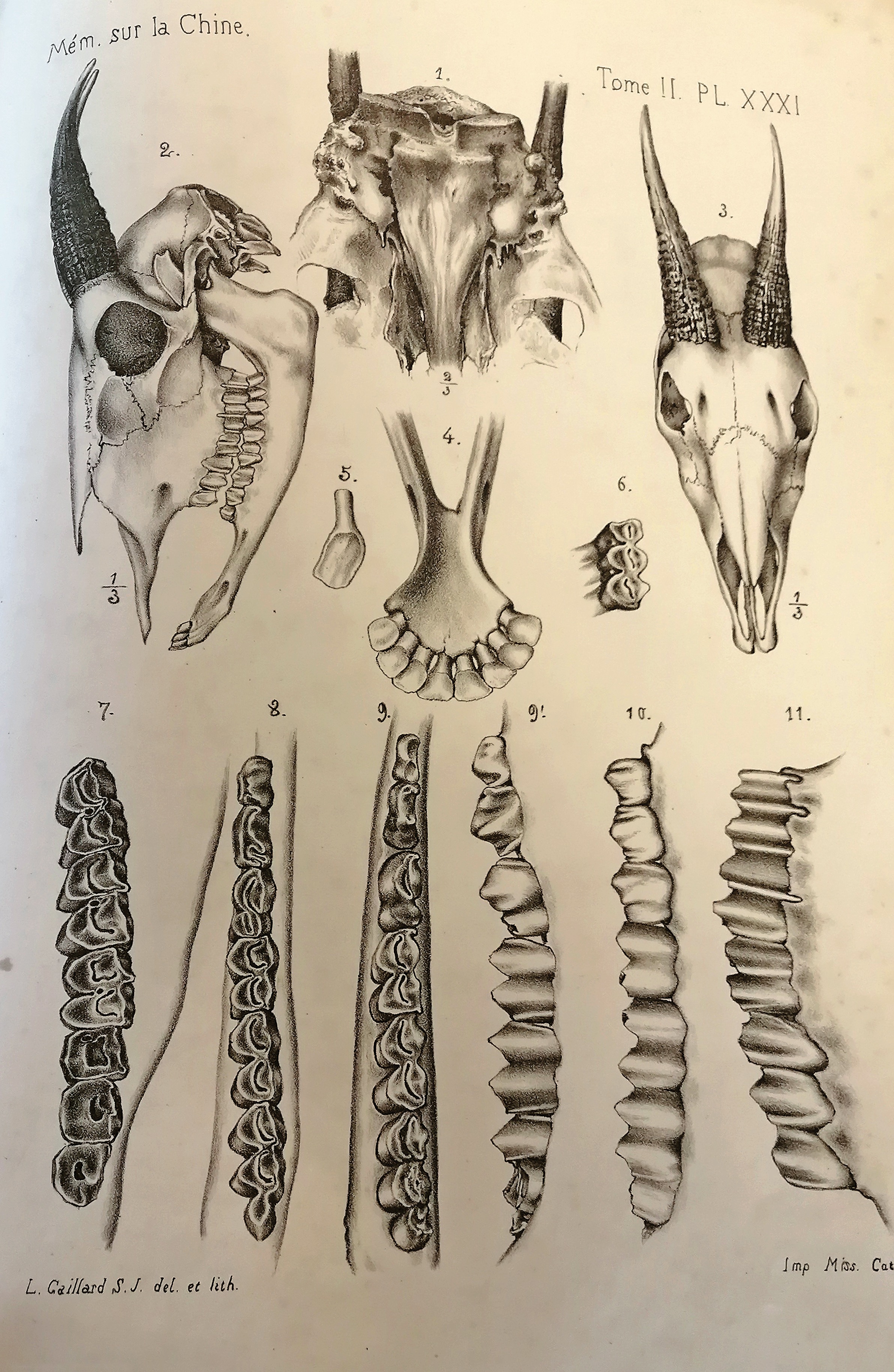 1888年,《中华帝国自然史》第二册《哺乳动物Ⅰ》出版,其中除了庄其仪绘制的插图外,参与的人更多,如当时担任土山湾孤儿工艺院副院长,同样具有艺术天赋的方殿华神父(LouisGaillard)。庄其仪也是土山湾画馆的著名作品《新史像解》的插图设计者,还曾用指南针绘制《南京地图》。在第二册中,他参与绘制了一幅羚羊的头骨和牙齿,可惜不久就被派往海门和南通地区传教,无法再继续这项工作了。之后接替插图绘制工作的,是后来担任土山湾照相制版部主任,成为张充仁老师的安敬斋修士。第二册其中一幅的署名为“画馆学生安敬斋”,而其他几幅的署名为“耶稣会士安敬斋”。结合安敬斋的生平轨迹,这些作品大约作于他进入耶稣会修道的前后。可以这样说,除了恩师刘德斋外,安敬斋也曾受过庄其仪的指导,当时的教会也有意培养他作为庄其仪的接班人。