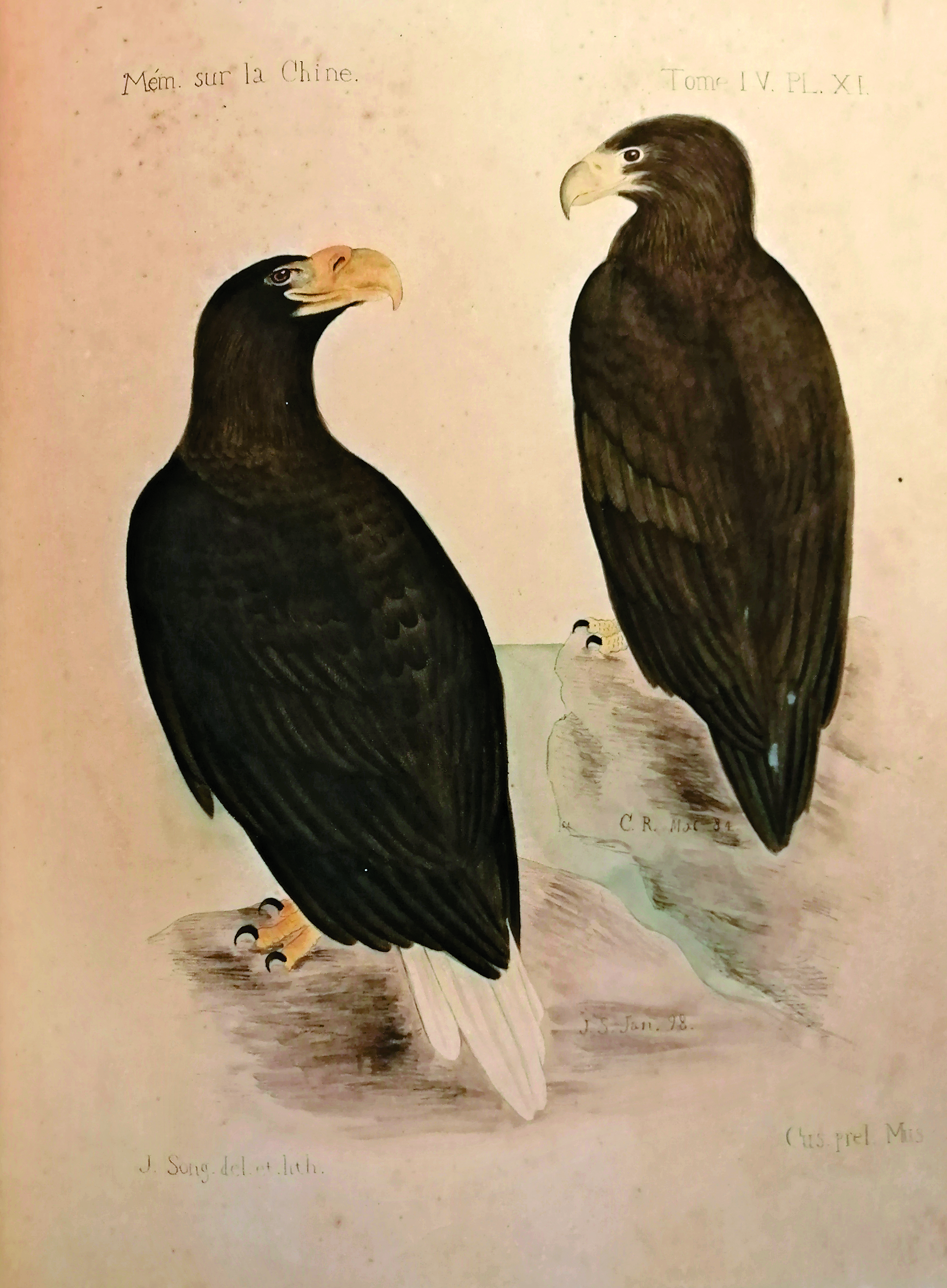 1898年出版的《中华帝国自然史》第四册《鸟类Ⅰ》,土山湾画馆的宋德林画师继续担当重任,画师王思福也参与了绘制。宋德林可谓深得庄其仪神父真传,里面有多张水彩画,均为两位的“隔空对话”。某些插图若非有注,旁人恐很难猜到左右两只鸟分别出自中外两位画家之手。