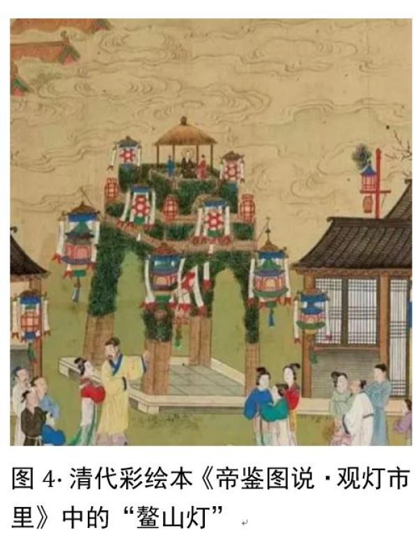 清代帝王仍十分青睐“鳌山灯”。自雍正朝开始,正大光明殿每年正月悬挂“鳌山灯”,殿前例设烟火。据成书于乾隆年间的《钦定日下旧闻考》记载,每年上元节前,“于寿皇殿安放方圆鳌山灯牌坊,自七层鳌山至十三层,十九日乃撤”。乾隆帝亦有《咏鳌山灯》诗云:“驾山海上浮,秉烛夜中游。”据此来看,清代宫廷在元宵节搭建的“鳌山灯”形制亦十分高大精致。在绘制于18世纪初期的清代彩绘本《帝鉴图说》(法国国家图书馆藏)中,有一幅题为《观灯市里》的图画,虽然取材于唐代长安城上元节街市观灯故事,但画面中所绘“鳌山灯”可能反映了清代鳌山灯棚的形制特征。这座鳌山灯棚下,有四根鳌柱作为支撑,其上为木质架构、缚扎冬青松柏枝叶的主体灯景,层层相叠,点缀各式大小花灯,最上层设一小亭,仿佛高耸入云,亭内端坐一位道教神仙人物,左右各立有一侍者。从图像要素与意象内涵角度来看,这座“鳌山灯”的形制设计虽然相对简约,但仍呼应了“形似鳌山”“金玉亭台”“仙圣所居”等要素,体现了“鳌山”神话母题的基本意象内涵。
