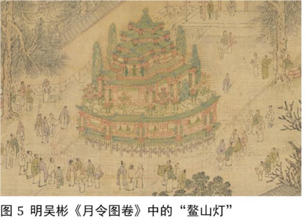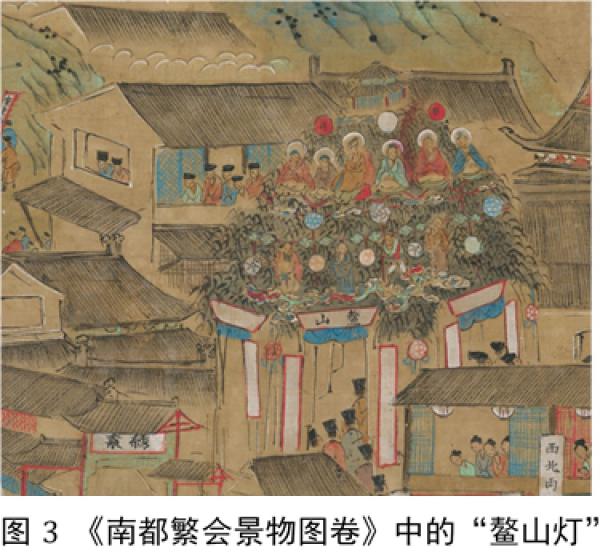 在另一幅表现明代南京社会生活繁华风貌的图画长卷《南都繁会景物图卷》(中国国家博物馆藏)中,也绘有元宵“鳌山灯”景观。根据题款显示这幅画作出自明代画家仇英(约1497—1552)之手。图卷中所绘的“鳌山灯”耸立于街衢,与周围楼宇齐高,整体形制为层叠架构,覆以松竹类翠枝,再以各式灯彩、神仙人物点缀其间,下开六门,正门横楣榜题“鳌山”二字。六门及鳌柱以上,主体灯景分为三层,下层为八仙像,中层设佛、道教神像六尊(均绘有圆形头光,显示其高阶神圣属性),最上层(顶端)立一小亭,象征海外仙山上的金台玉宇。