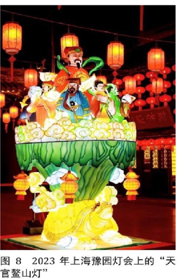 近代中国社会动荡,传统文化习俗也历经变迁,作为元宵节传统民俗重要内容的“鳌山灯”制作技艺在各地的传承大多中断。如今,随着中国传统文化的振兴,元宵灯会及相关民俗文化作为非物质文化遗产项目得到保护与发展,各地的元宵灯会上又纷纷重现了“鳌山灯”景观。并且,通过将传统工艺与现代科技、审美理念相融合,当代“鳌山灯”的具体形制与意象内涵得以创新发展。例如,2017年南京秦淮灯会主办方在走访老艺人、搜集文献资料、复原鳌山灯扎制技艺的基础上,结合现代灯彩技术和南京文化特色,设计制作了背负仙山、佛塔的大型“鳌山灯”。2022年Bilibili网站推出的国风元宵晚会《上元千灯会》上,一座巨大的“鳌山灯”成为整个元宵晚会的核心景观与叙事主线,并将当年生肖“虎”的图像元素融入这一传统灯景。2023年上海豫园新春元宵灯会上也展示了一座“天官鳌山灯”,并作为“天官赐福”巡游活动中的主体灯组,从形制上看,这座“鳌山灯”在保留传统鳌山灯“巨鳌戴山”“八仙”等元素的基础上,又整合了“上元天官赐福万民”的信仰习俗。由此来看,当代元宵灯会上的各种“鳌山灯”景观,在承续“鳌山”神话基础内涵与文化标识意义的同时,又充分发挥现代科技优势提升灯景体验效果,并加入更多的主题元素和内涵创新,使其整体意象与象征意义更为丰富。