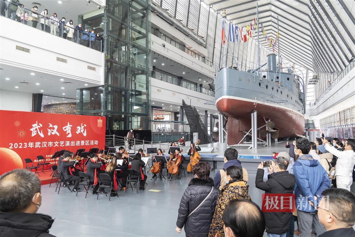 看过精彩的杂技秀,观众们沿着栈桥步入馆内,瞬间被一楼舰尾大厅悦耳的乐曲声吸引,来自武汉爱乐乐团的演奏家们齐聚一堂,共同奏响了欢庆佳节、迎接春天到来的美好序曲。《春节序曲》等中国经典民族乐曲轮番亮相,武汉爱乐乐团专门为契合武汉市中山舰博物馆浓厚的文化氛围,演奏了《红星歌》等革命歌曲。不少观众表示:能在博物馆零距离听到交响乐团演奏,是一种非常新鲜和愉悦的体验感。