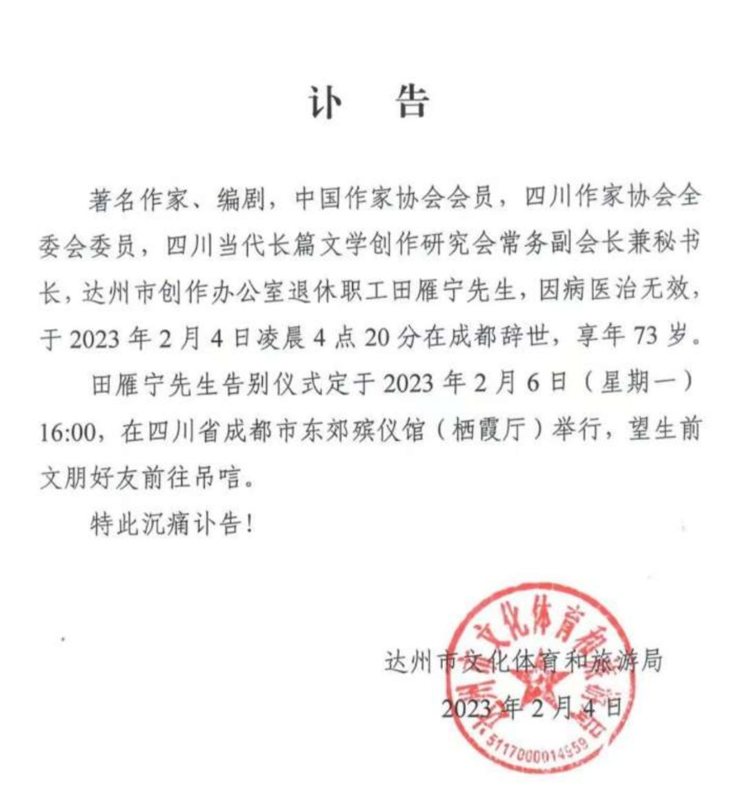封面新闻记者再次釆访田雁宁的助理林女士,以及田雁宁的儿子、著名编剧田子立。他们向记者透露:田雁宁先生遗体告别仪式暨追悼会将于2月6日下午4时在成都东郊殡仪馆举行,生前好友及文学界、影视界等众多人士将来送别。