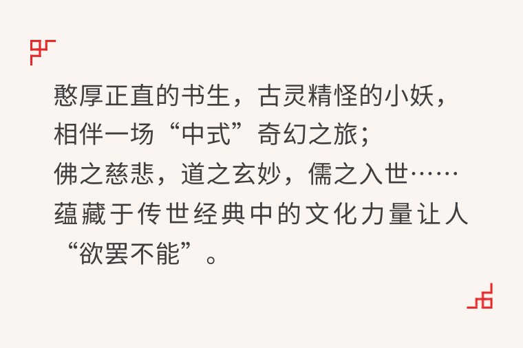 仅仅是以小小“脑洞”形式出现,就旋风般刮起一阵“文言”热的“汤直传”,不免让人想到几年来,被称为“中国动画电影现象级作品”的《西游记之大圣归来》、惊艳了2016年整个夏天的《哪吒之魔童降世》,以及近期开播即爆款、让“上美厂”回归国漫创作高峰的“中式志怪”短片集《中国奇谭》。它们虽然体量不同、形式殊异,却都“叫好又叫座”,为众多观众打开了一扇品味传统文化的“窗”。优秀传统文化,为何成为当下文艺创作的独门绝技?时代的眼光,还期待它有哪些“打开方式”?