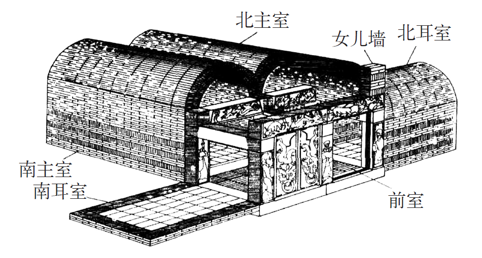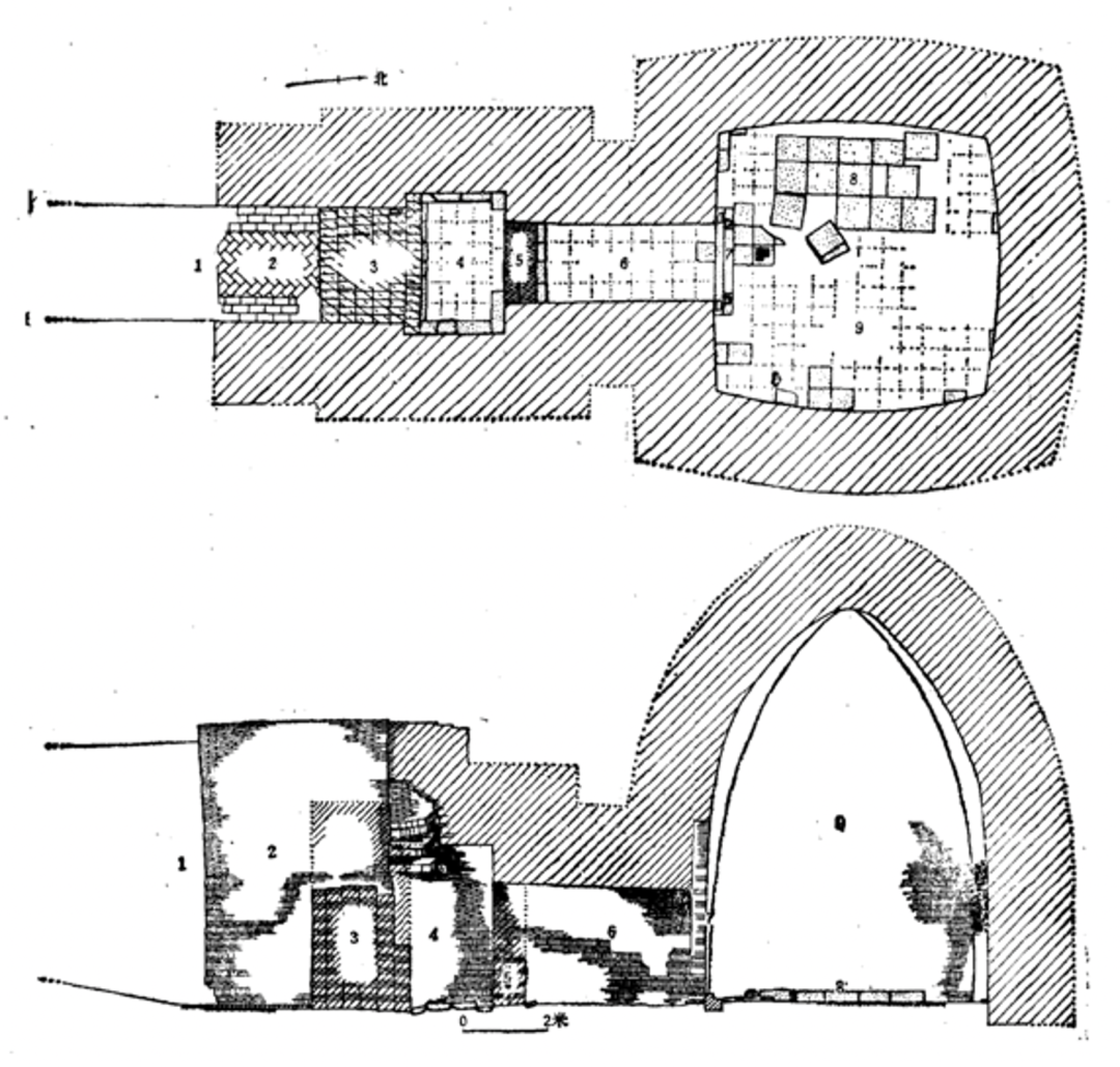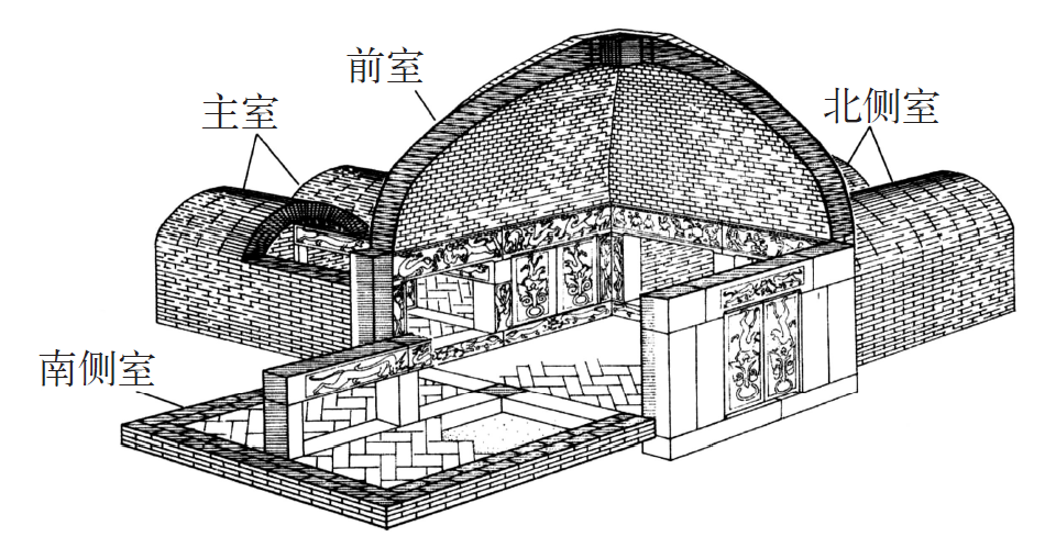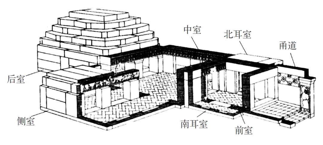西汉早、中期,墓葬形式出现了巨大的变革。竖穴土坑木椁墓逐渐消失,横穴砖石结构墓葬开始盛行。[14]目前可知最早的石质穹窿顶墓室为徐州铜山的楚元王刘交(公元前201年—前179年在位)墓,[15]后有河南永城芒砀山保安山柿园汉墓(前137)、[16]广州象岗南越王墓(前122)、[17]河北满城汉墓(前113)、[18]曲阜九龙山鲁孝王陵(约宣帝时期)等,[19]都以凿石为室、穿山为藏的方式修筑。俞伟超先生认为:西汉中后期以后,许多砖室墓的形制是受这些墓葬的影响。[20]