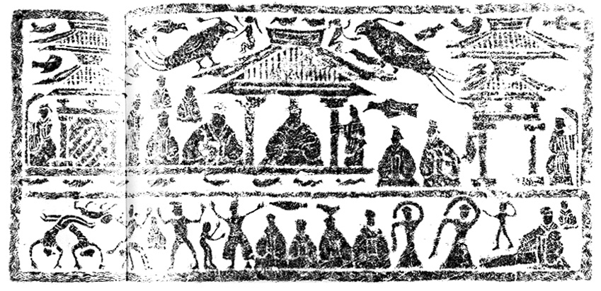 图6/升仙图,山东武氏祠左石室屋顶前坡东段画像(引自中国画像石全集编辑委员会:《中国画像石全集第2集山东汉画像石》,山东美术出版社,2000,图版八七)