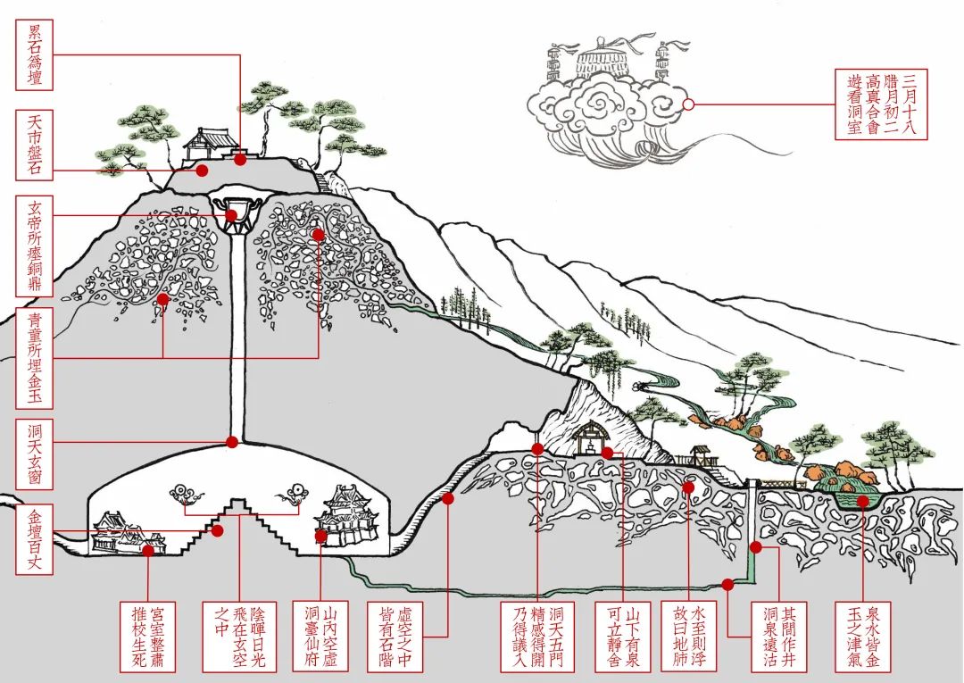 首先是进入方式。虽然误入洞天常见于传说之中,但从道教的义理而言,洞天的五处大门各有其位,并呈天然洞穴的形式。奉道者只有在精心斋戒祈请之后,才能够进入洞天之中。换言之,这种相对平行的洞门乃是专为进入洞天而设的。