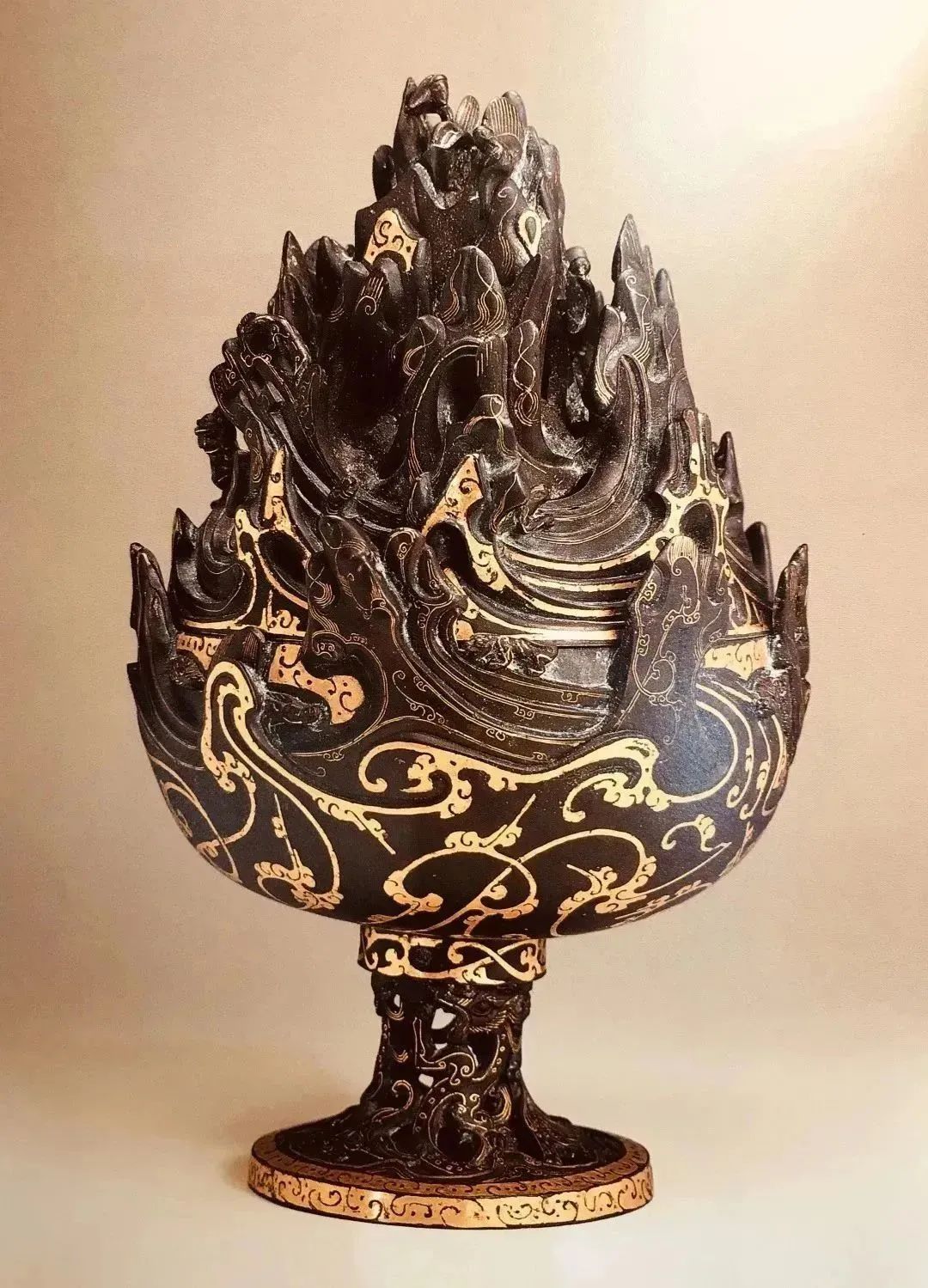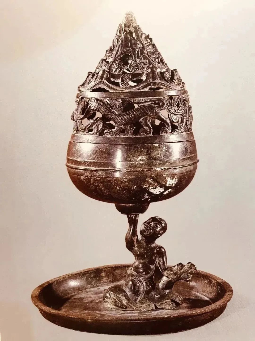 图1/博山炉,河北满城汉墓出土,炉上可见山峦与穿梭其间的神兽、动物等(引自中国青铜器全集编辑委员会:《中国青铜器全集12:秦汉卷》,文物出版社,1998,图版一二九、一二八)