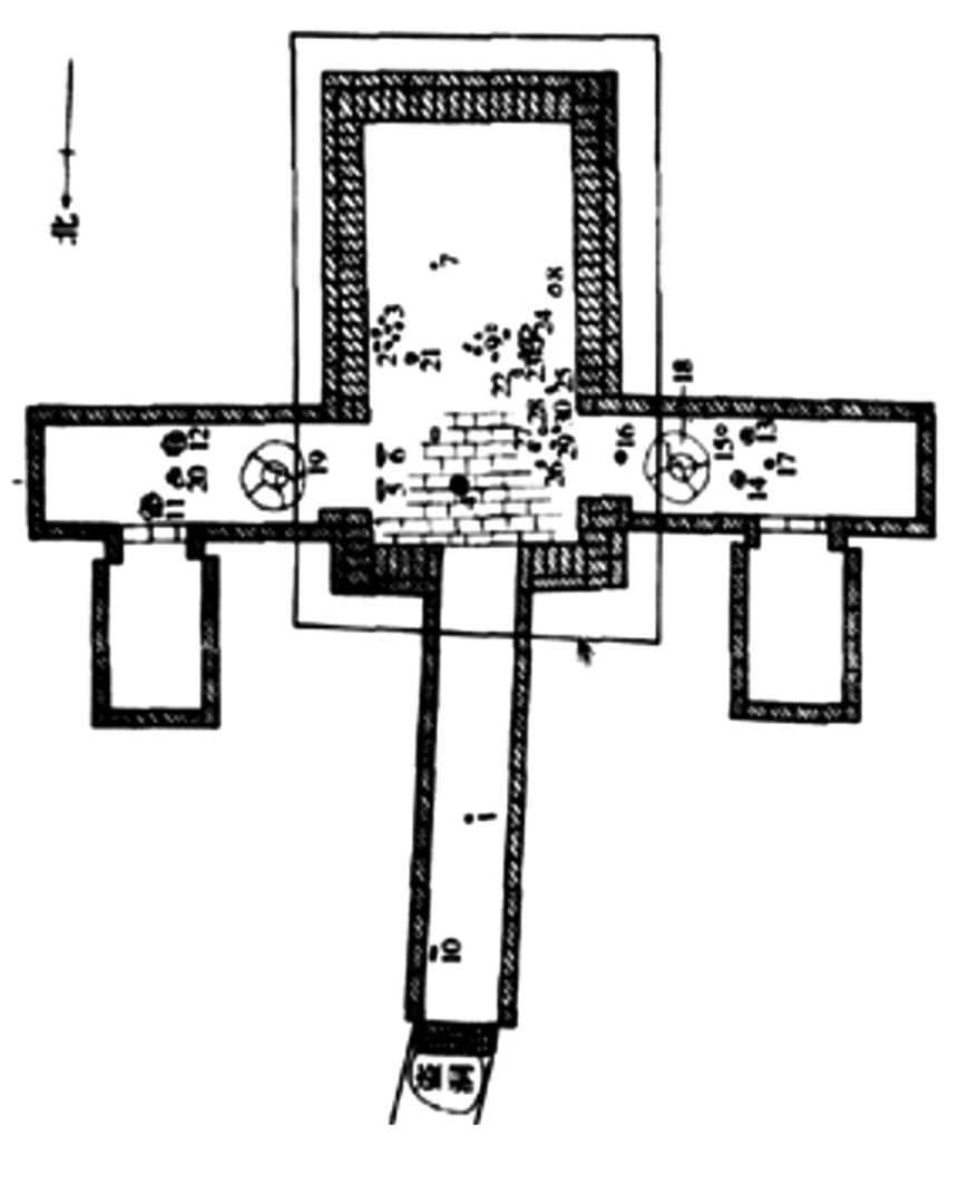 接下来的三国时代提倡薄葬,墓室中的随葬品、丧葬仪式以及空间都产生了改变。西晋中期以后,中原地区葬制由多室墓转变为单室墓,一般由斜长坡墓道、甬道、墓室构成,甬道为券顶,墓室则多为穹窿顶或四角攒尖顶。墓道长短、墓道台阶数量、有无石墓门等成为区别身份的标志(如图18中的北魏宣武帝景陵)。[30]此时,墓葬平面图已与“洞天”的模型非常接近了。