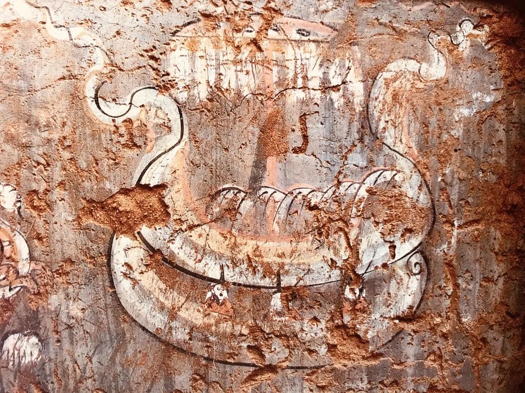 目前发现最早的壁画墓为河南永城芒砀山柿园汉墓。此墓主室为平顶,墓室顶及附近空间绘制了一幅巨型壁画(图7),画面以红色颜料为底,中央盘踞着一条巨龙,巨龙舌部卷着一条白蛇。龙腹两侧分别有一只白鹤及白虎。四只动物应为四神图像。[24]周围绘云气纹,外围则绘穿璧纹。关于这幅画的内容,许多学者认为与昆仑仙境有关。[25]