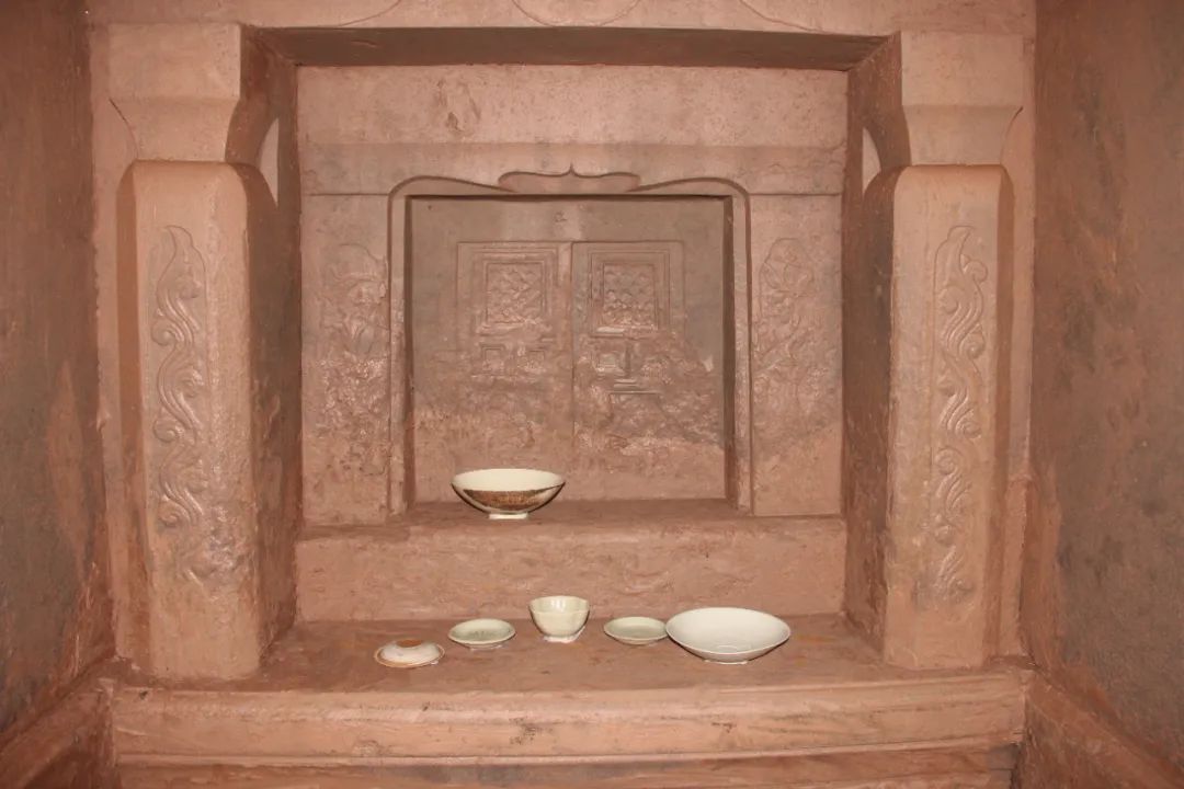 除装饰外,墓室空间内也包括随葬品、棺椁。因画像石刻宋墓的棺椁几乎不存,故对此不予说明。在随葬品方面,对比成都平原的宋代砖室墓,墓室内多见俑类,如武士、侍者等。而在画像石刻墓中,武士俑以石刻武士出现在门楣石下门柱石上,侍者则位于墓壁后侧壁或后龛。随葬品有碗、盘、碟、壶、罐等,表现为供品盛器,与墓室后龛象征的墓主人位一道,体现墓室内存在的供祀行为。因此,墓室内石刻画像、随葬品、墓室空间彼此联系、互为一体,共同营造墓主亡魂的地下空间。
