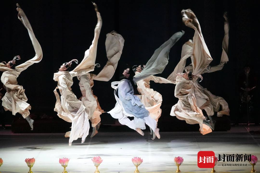 该剧分为上下两个半场。通过现实与梦境的结合,将曹植的经韬纬略、盛世才情与凄悲命运勾勒出来。独舞、双人舞、三人舞、群舞……充满了浪漫的空灵之美。舞者们甩着红袖轻盈旋转,不时腾空跳跃,一展中国舞蹈身段的温婉、灵动、潇洒、柔媚,令人赞叹。