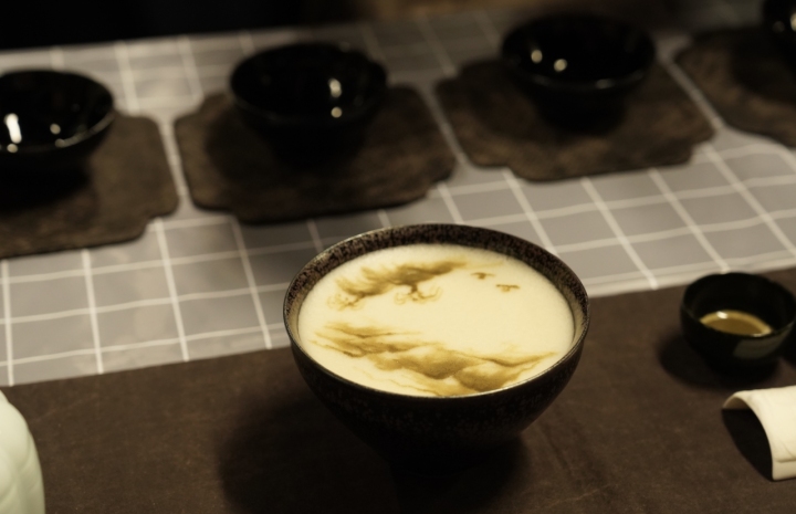 “无由持一碗,寄与爱茶人。”结束茶文化分享后,韩老师进行了茶百戏表演。粗笔勾勒,工笔细描,一幅写意山水画就出现在建盏之上。兔毫釉面衬得茶沫绵密细腻,抹茶粉末画就的山水意境悠远,传承了千年的品茗意趣展现在众人面前,就如同茶日历里收录的宋代饮茶图一般。
