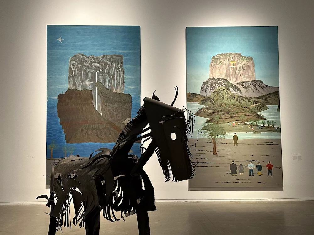 展览现场,夏阳《虎帐点兵》与雕塑《公狮子、母狮子》