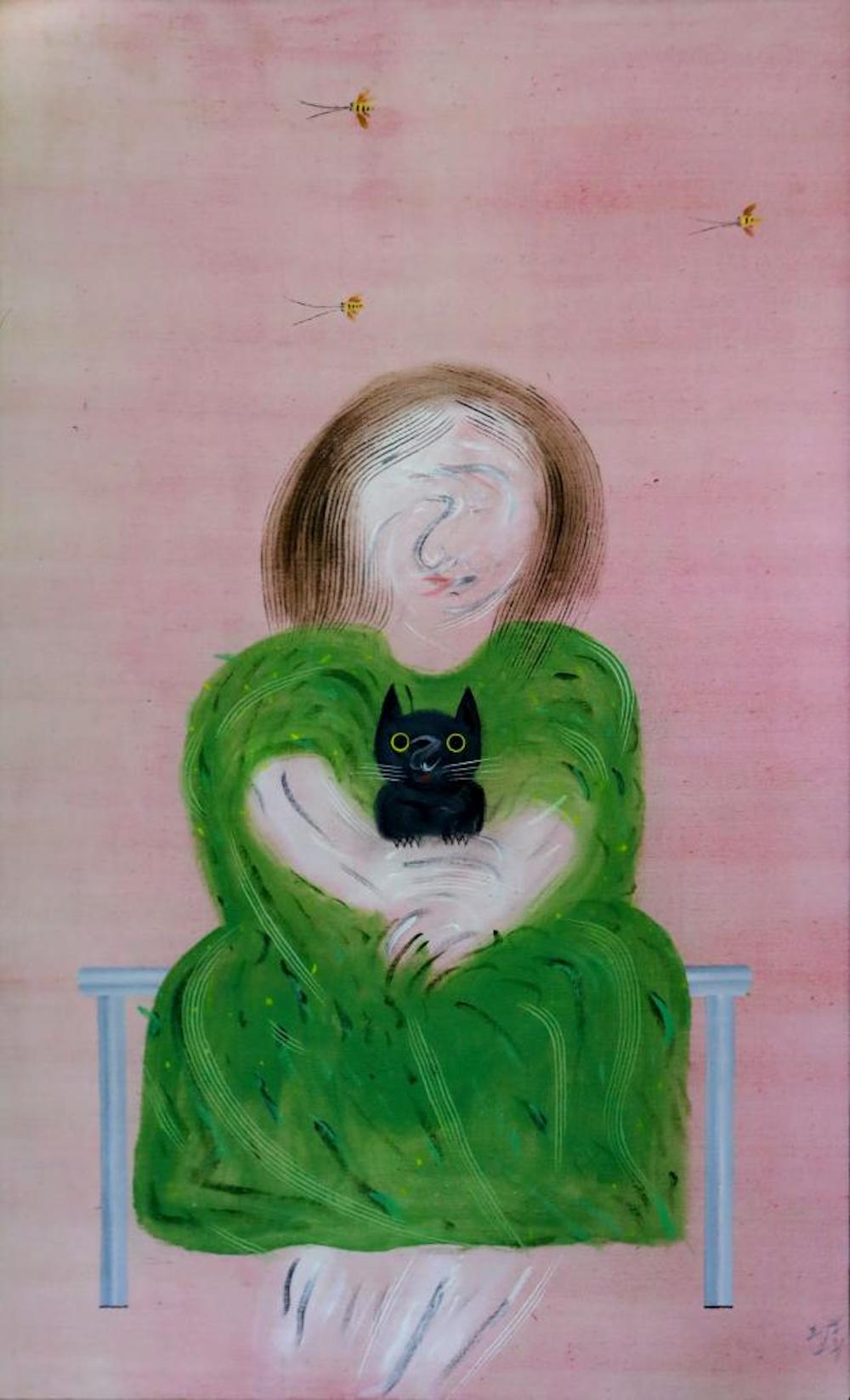 夏阳,《抱猫的女人》,2021年,布面丙烯,134×82cm。上海当代艺术博物馆藏。