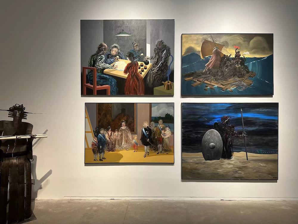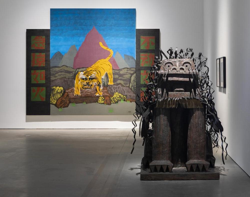 他的作品《盘古氏》来自于中国神话,画面中侧卧于地面的盘古将整幅画面沿中线一分为二,划定了一个位于混沌与秩序之间的“时刻”。架上作品《虎帐点兵》与雕塑《公狮子、母狮子》的组合,构建出另一种民间叙事。