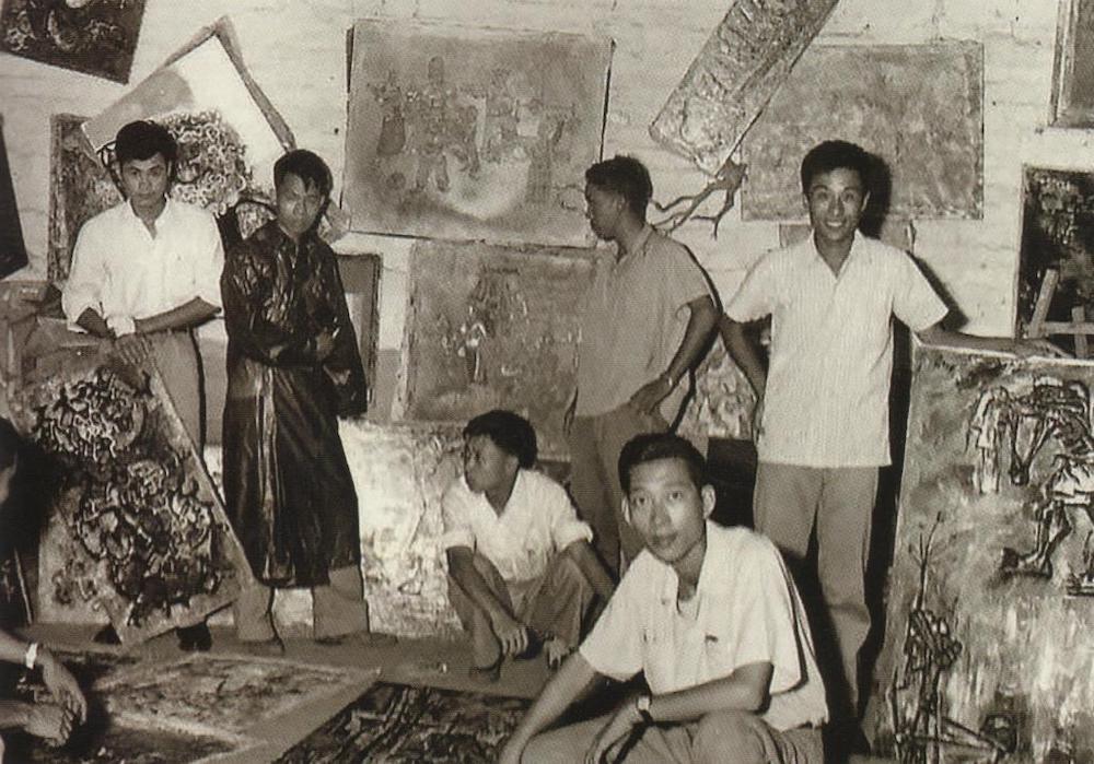 夏阳(左二)与画友于防空洞画室聚会,1956年。图片由艺术家提供。