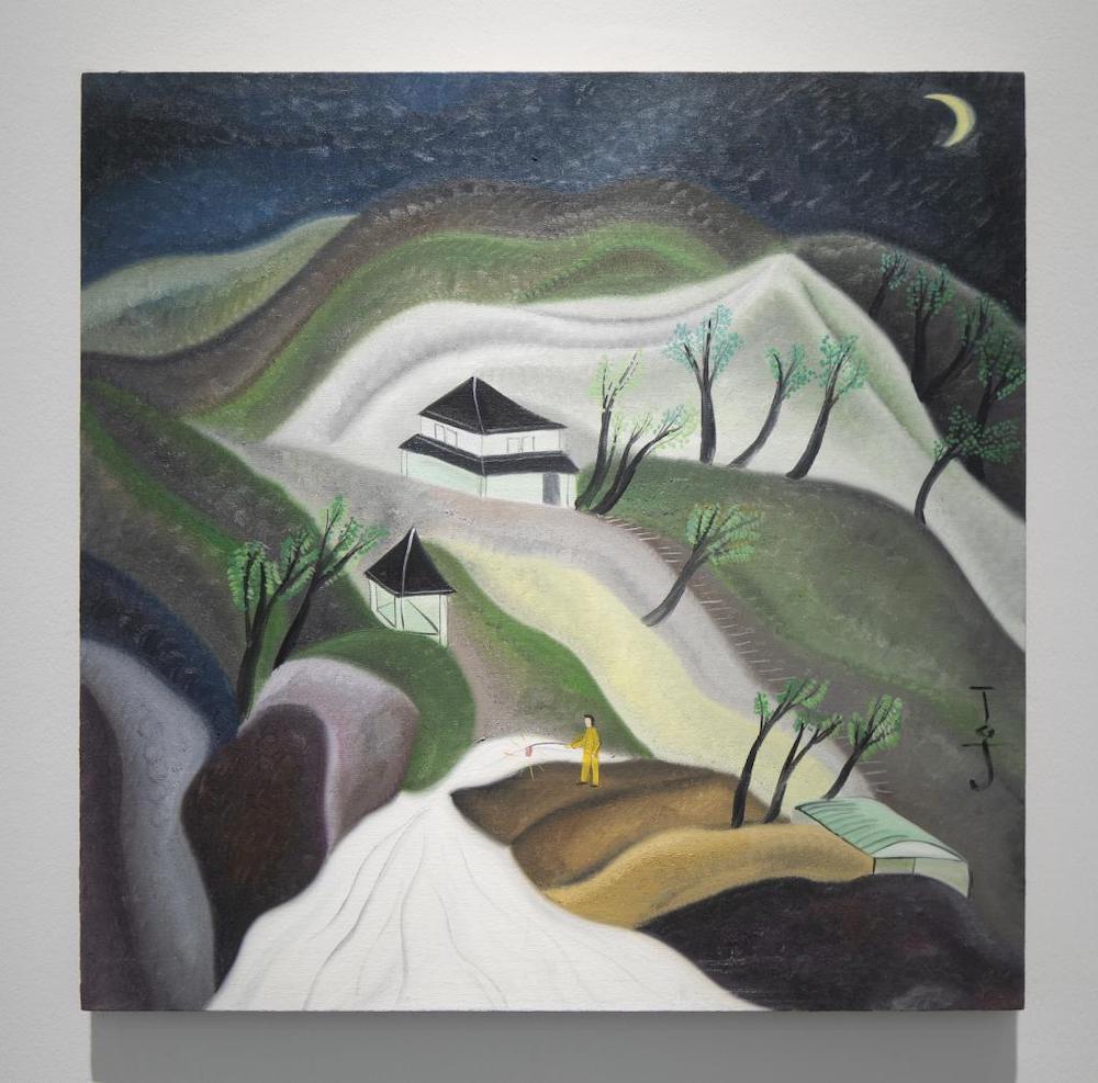 如果观展动线以丁立人为始,两只“盒子”后的首件作品是《天台胜景》,这件2013年的油画画了丁立人的家乡台州,画家在此度过了童年。“我6岁开始画画,没有上学,也没有美术老师。听了《西游记》的故事就画了。”丁立人回忆说,“我好像不是在画画,而是跟着唐僧师徒四人去取经。”