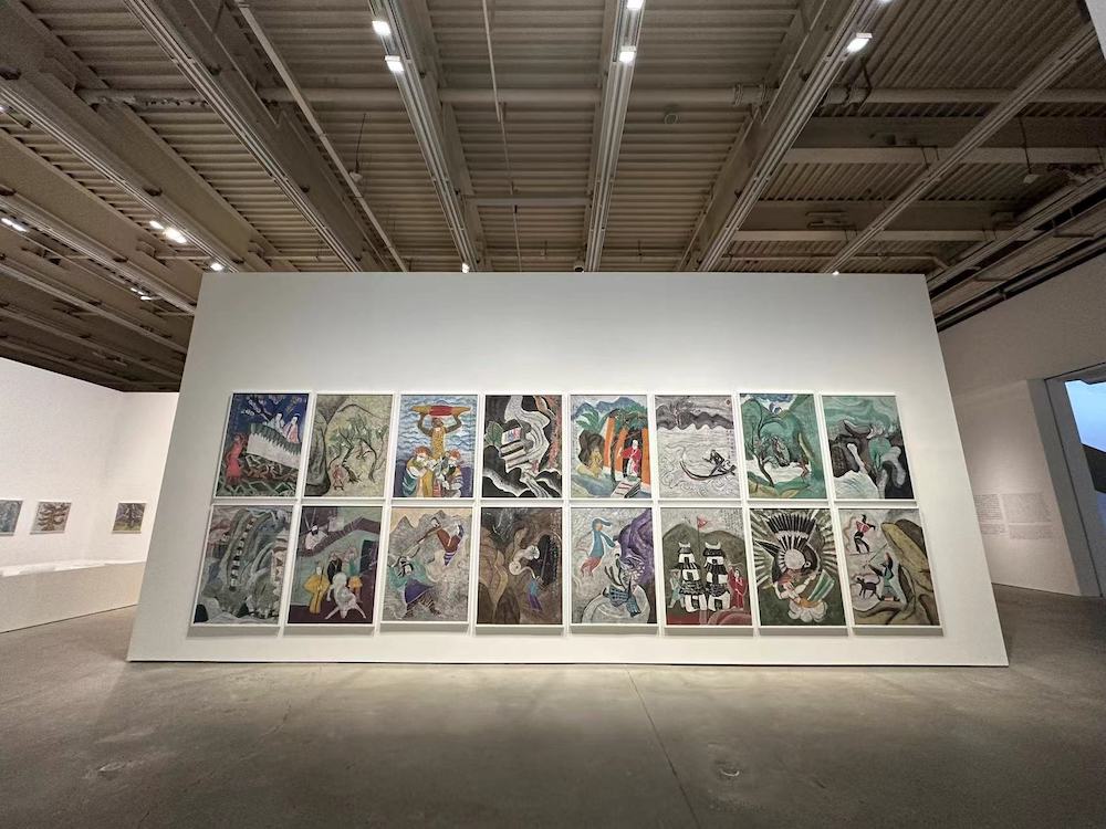 展览丁立人的部分,占比最重的便是“西游记”系列。丁立人的父母曾在家中成立台州海门镇上有名的京剧戏班,排练时生动的扮相深刻印在他脑海中,也成为其七十年代所作戏曲最初借鉴的场景。“西游记”系列可以视作戏画的延续,构图借鉴了戏台的美学传统,但并不单独突出某一元素,而将画面中多点集成的叙事关系纳入整体考量。