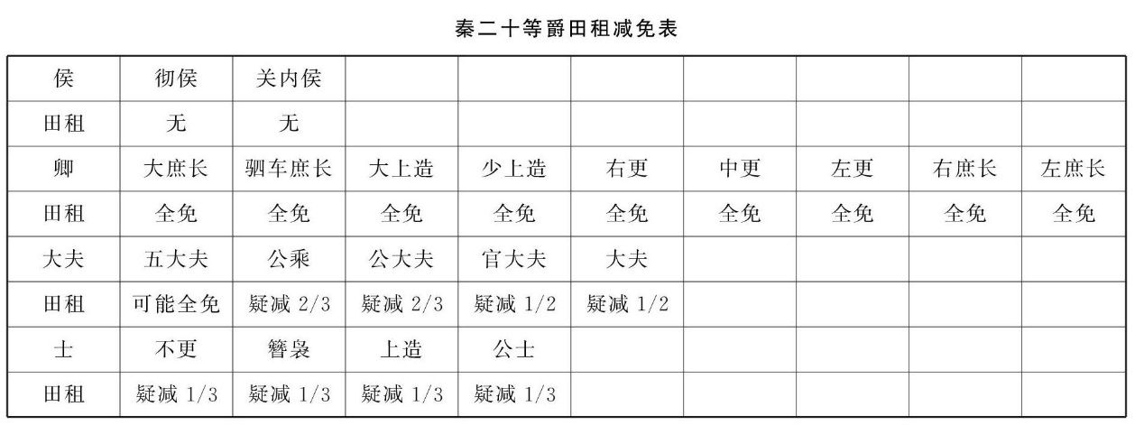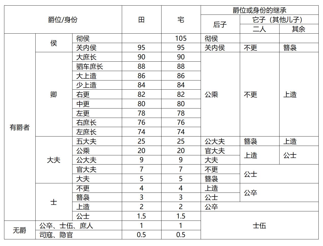 如表2所示,如果是士爵和大夫爵这两个层级,儿子(后子)要继承父亲的爵位,必须降两级继承。比如父亲通过军功获得了秦国的第四级爵位不更,那他儿子继承时就只能享受第二级爵位上造的待遇;其余儿子如表2所列,只能继承拥有更为低等的爵位(降六级或七级继承),上造和公士属于最低的爵位,不再继承传递。这样一来,儿子所继承的土地便会大大缩水。如果子孙无军功,即使父亲所获得的爵位很高(侯爵除外),五辈之后所拥有的田产也只比普通平民略多一点。