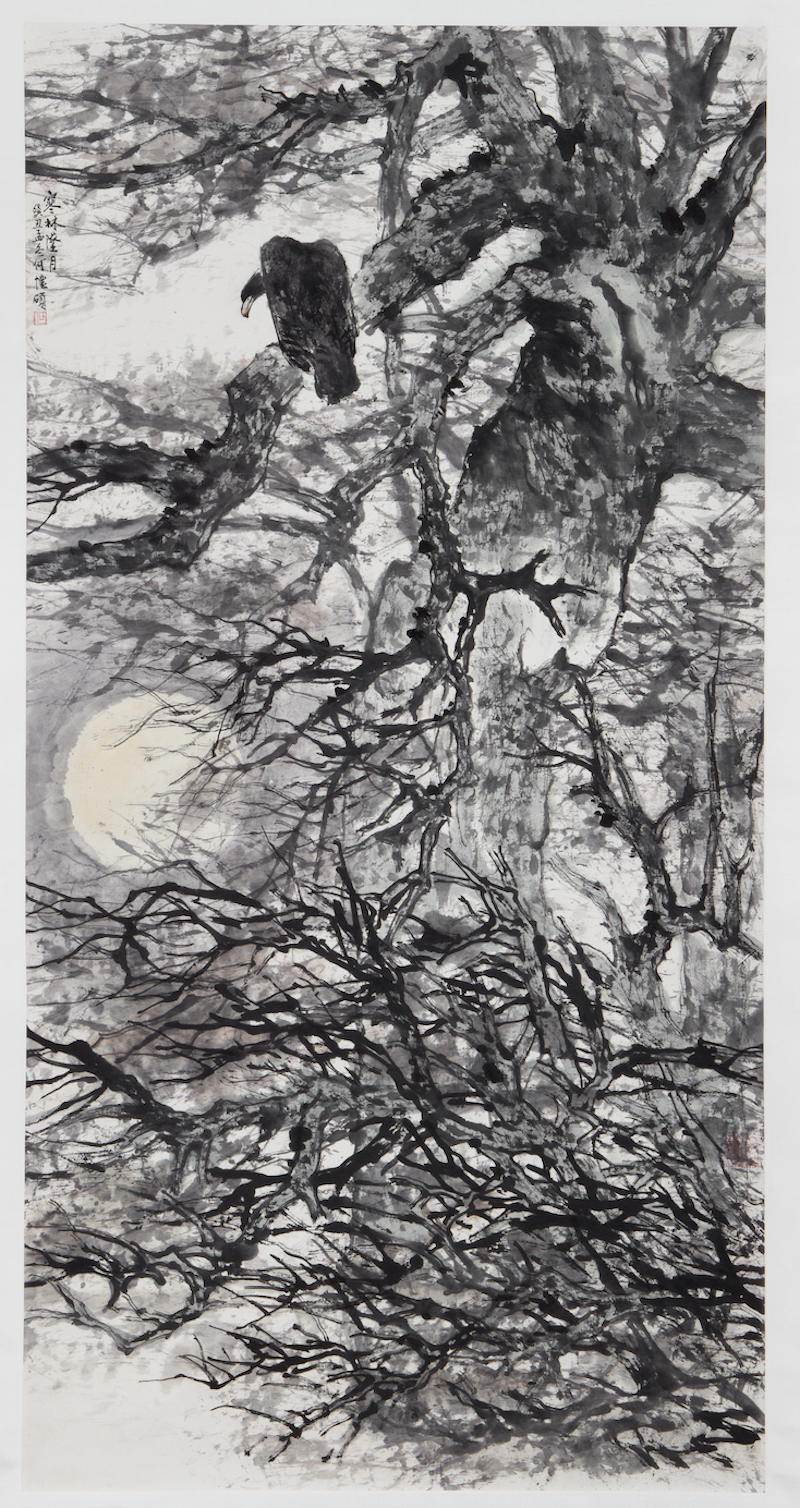 何怀硕《寒林坠月》,1973年,纸本水墨设色,134×67cm 何怀硕早年的《寒林坠月》(1973),有意强化线条的排沓、穿插,以线之繁复,对比月之简空