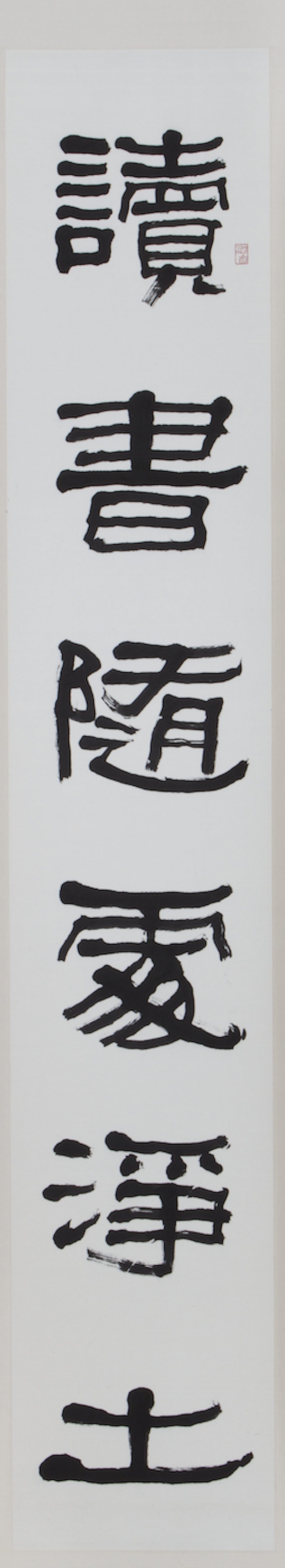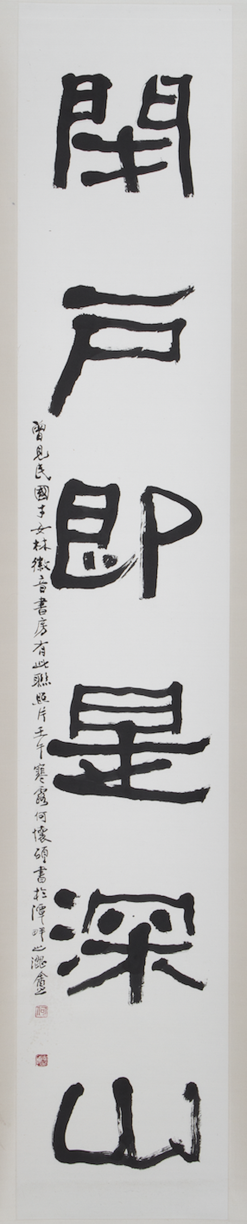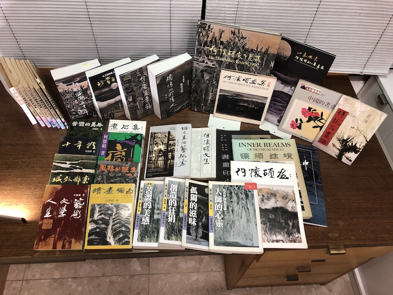 何怀硕先生的书房已超越一般意义的坐拥书城。一层楼,除一户邻居,其他五户都是涩盦何宅,其中四户打通,何怀硕先生好像在家里玩空间构成,各种姿势的书架延绵不绝。进门右侧是餐厅,餐厅邻厨房,一面是白色的书架,以小十六开1980年代出版的文学书籍和大陆画家赠阅的图书为主;一端窗户边的空墙上挂着一副王福庵的隶书联,地上有台跑步机,从跑步机的摆放可以看出,主人并不是常用它;进门有两个顶到天花板的金属书架,餐厅一侧是整套的港版《名家翰墨》和一些故宫典藏图录,还有河北教育版的“二十世纪书法丛书”等;厨房的外墙对着大门有个斜角,他按墙面大小量身打造的隶书联“读书随处净土,闭门即是深山”。随即就是一个框架金属结构书架和养悬挂植物的空间,架上大部分是《文星》等先生年轻时代看过的刊物,以备用时查阅!书架的结构处理,便于踩踏上隔层取阅;这是一个主厅,纵深处迎面是一堵书墙,主要是人文类书籍,记得上端还有一套何怀硕先生喜欢的批评家李长之的全集,先生说以前看过选本,后来出全集还是买了一套;南面三个大窗户临着碧潭,视野和采光都很好,在窗户和窗户之间的墙面挂着一个小镜框,记得有一幅是钱慧安小品,先生边介绍边感慨,古人有很多这样的画家,没什么创意,但传承了文雅和精致,也很好看!还有陈曼生联:“无言都是趣,有想便成缘”;靠里的那个窗户边用书架间隔了敞开的空间,内里放着一个工作台,有电脑等物件;其实在这个大空间里,沿墙都放置一些旧式的写字台,靠窗也是横竖两张,两面放着日据时期留下的敦实原木的三脚圆坐靠背椅,每个工作台上都放着些文具,仿佛随时可以拿起来就工作,来的客人可以各自坐在自己的桌子两旁对话聊天;另一面嵌有铁片的毡墙,时常挂一些先生喜欢的书法,这个厅的悬梁上有几个横镜框,里面挂着台静农和叶公超等写的字,记得还有一幅台静农写的隶书对联:“铁肩担道义,辣手著文章”,具体忘了挂在哪块墙面。这个厅左转一个空间和过道,空间放着书和写作的资料,还陈列着几件古董鸣钟,写作间里有坐姿的台板,也有站姿的台板,抬手就可以取资料的分类格,是怀硕师按自己的工作习惯,精心设计的,隔板墙面有提醒的记事纸,有常用电话号码,还有一张与大陆老友的合影,照片上是邵大箴、水天中、何怀硕、范景中、曹意强;过道两面是书架,书架上是美术理论类的书和画册,过道入口上方挂着一件康有为旅日避居时期写的字:“避岛”;书架以外的墙面是压克力做的文玩杂件的陈列格,大多是先生各地旅行时的纪念;过道里面是先生的画室,也是一个几间打通的厅,记得第一次拜访进去过,后来几次就没有进去。