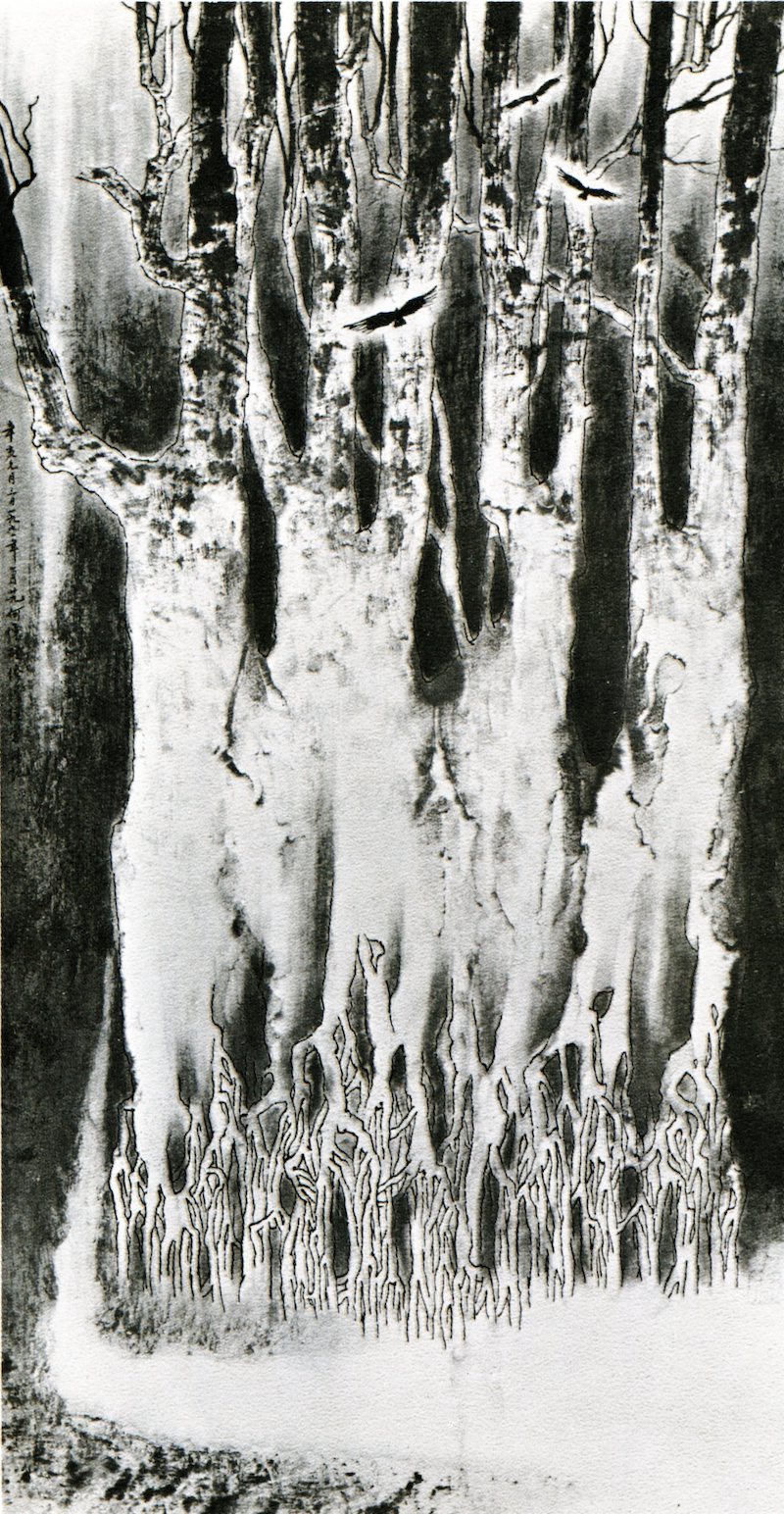 何怀硕《原始森林》,1987年,纸本水墨设色,95×178cm