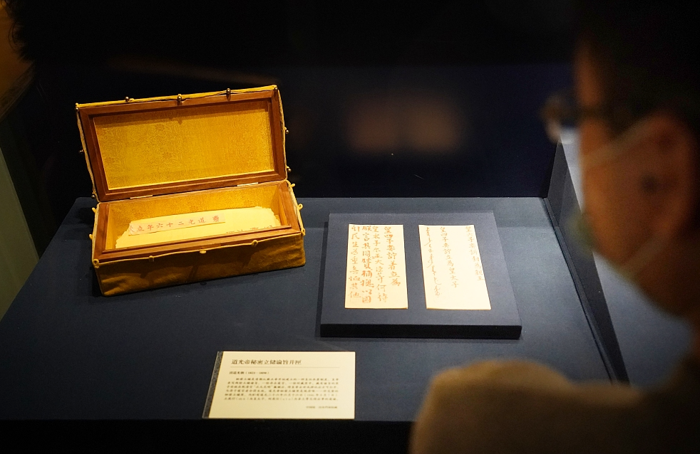 2023年2月15日,北京,二十世纪初中国古文献四大发现展,图为在“明清档案”专题展厅展出的道光帝秘密立储谕旨并匣。视觉中国图