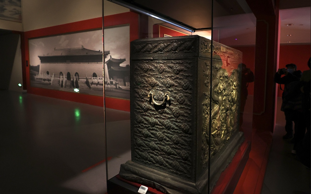 2023年2月15日,北京,二十世纪初中国古文献四大发现展,图为在“明清档案”专题展厅,金匮吸引参观者。金匮原存放于明清两代的皇家档案库皇史宬正殿内,用以盛装皇帝的实录、圣训(明代称“宝训”)等珍贵典籍。视觉中国图