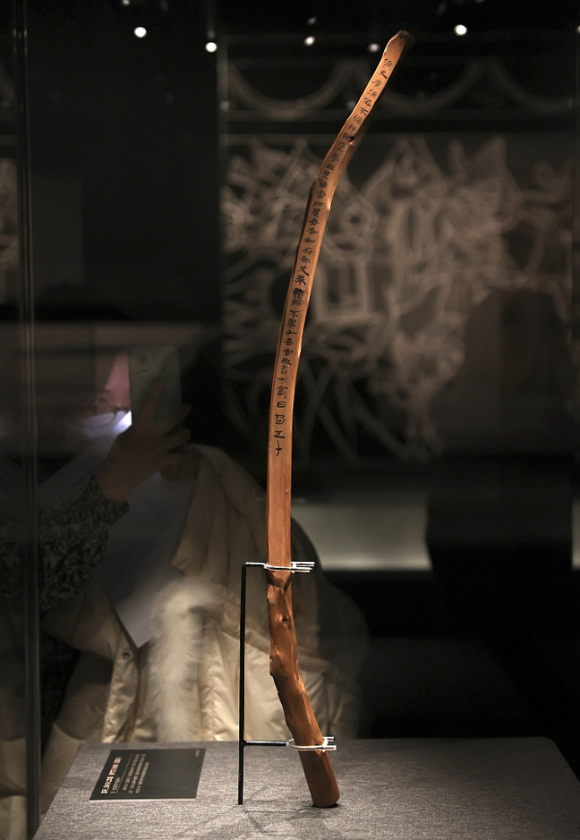 2023年2月15日,北京,二十世纪初中国古文献四大发现展,图为在“居延汉简”专题展厅,参观者拍摄汉代相利善弊剑册。中新网图