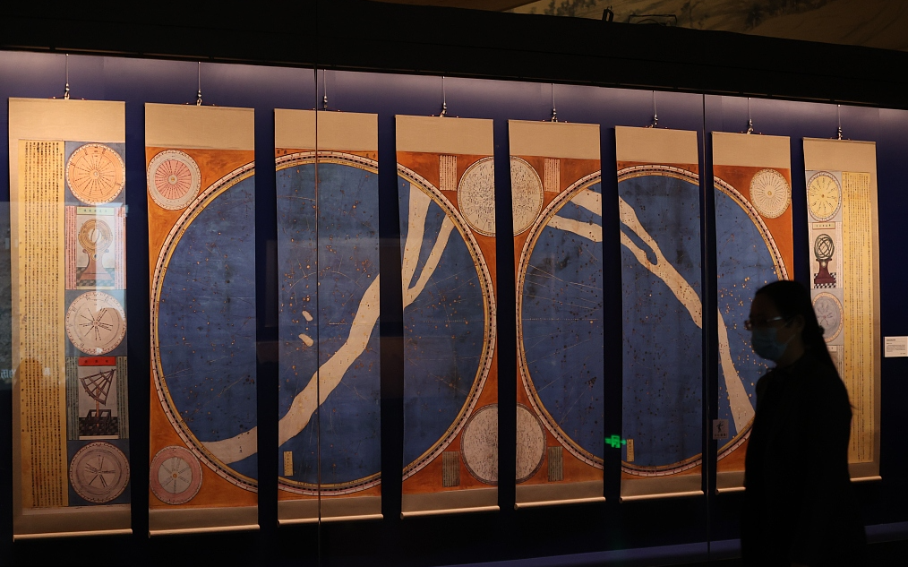 2023年2月15日,北京,二十世纪初中国古文献四大发现展,图为在“明清档案”专题展厅展出的明代崇祯年间赤道南北两总星图。视觉中国图