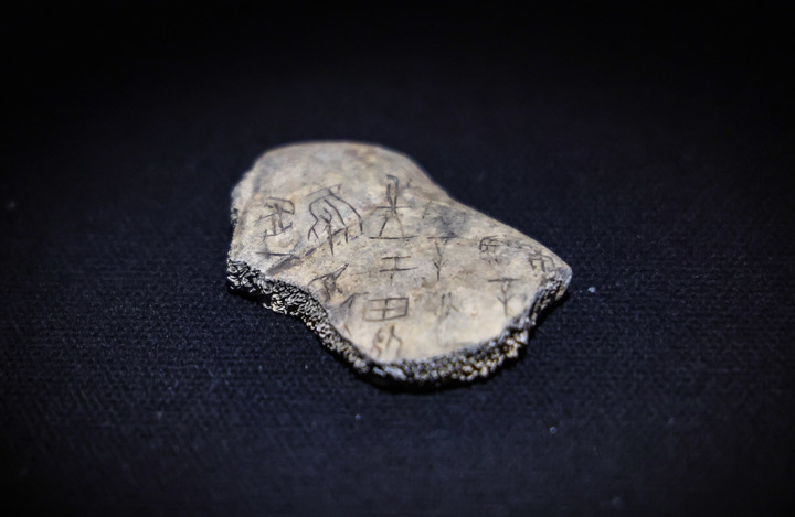 2023年2月15日,北京,二十世纪初中国古文献四大发现展,“殷墟甲骨”专题的“甲骨2174”。左上为甲骨文“兔”。新华社图