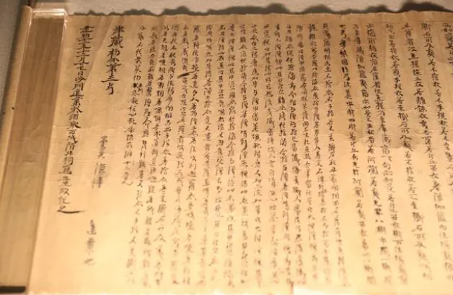 2023年2月15日,北京,二十世纪初中国古文献四大发现展,图为“敦煌遗书”专题展展出抄写于西凉建初十二年十二月(417年)的《四分律初分卷三》,是现存《四分律》最早写本,也是国家图书馆藏敦煌遗书中有纪年的最早一卷。中国日报图