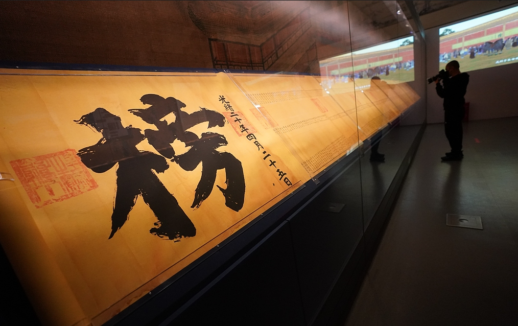 2023年2月15日,北京,二十世纪初中国古文献四大发现展,图为在“明清档案”专题展厅,清朝康熙年间《盛京城阙图》吸引参观者。视觉中国图