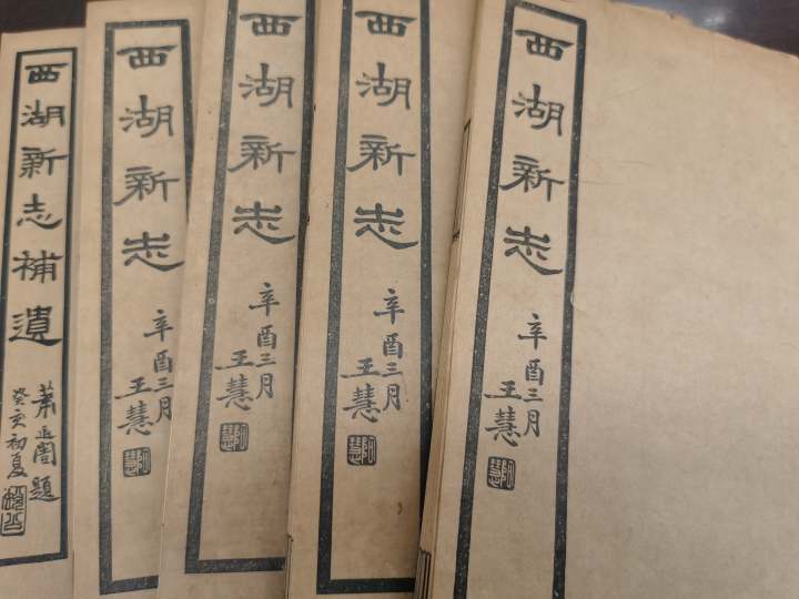 此书一部四册,初版于民国十年(1921),内容分山水、堤桥、寺观、祠宇、园墅、冢墓、人物、方外、物产、志余等十个志分类。其中山水分上中下三卷,寺观、人物都分上下两卷,共计十四卷。版权页上写着“如有翻刻千里必究谨此预白”,这也是晚近古籍常用的套话,好比电视剧片尾打上“本故事纯属虚构”。实际上古籍的翻刻蔚为大观,就说日本也不知翻刻了多少“唐本”,远过千里,更难“必究”。我发现的这一部虽是民国十五年夏的再版,但于四册之外还另有一册开本、纸张一模一样的《西湖新志补遗》。