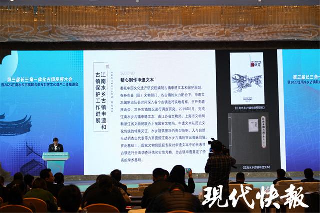 江南水乡古镇联合申遗,苏州是牵头城市。大会现场,联合申遗办(苏州市文物局)介绍了江南水乡古镇申遗工作推进情况。我们着力推进古镇保护专项立法。市级层面制定出台了《苏州市江南水乡古镇保护办法》《常州市焦溪古镇保护条例》《上海市浦东新区江南水乡古镇保护办法》,各遗产地也依据古镇保护管理实际制定出台了多项保护管理措施。苏州市文化广电和旅游局局长韩卫兵介绍,坚持做好古镇风貌保护、文物安全管理,开展普查登记和信息建档,全面挖掘梳理文物建筑、传统建筑、传统文化和非物质文化遗产等历史文化要素,也是工作的重点,我们出台了《苏州市古村落保护条例》,建立古村落保护工作评价体系和动态监测系统。将由‘城—镇—村’构成的江南水乡历史文化聚落体系作为完整保护对象纳入《苏州历史文化名城保护规划(2021-2035)》。