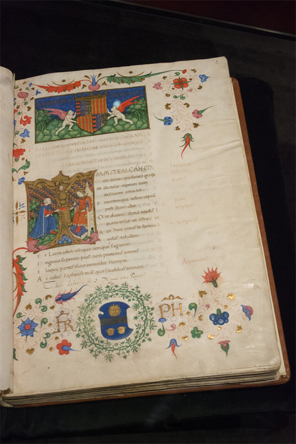 图书馆馆员索尼娅·奥尔默(SoniaOmo)带我参观了弗朗西斯科阅览室。她告诉我,瓦伦西亚大学历史图书馆里的很多藏书已经被扫描放在了网络上,人们可以在图书馆的官网上查阅、下载那些珍贵的中世纪手抄本。瓦伦西亚大学历史图书馆收藏有1000多部手抄本,其中226部12到15世纪的手抄本来自卡拉布里亚公爵(theDukeofCalabria)的捐赠。图书馆展厅的名字就以他的名字命名。
