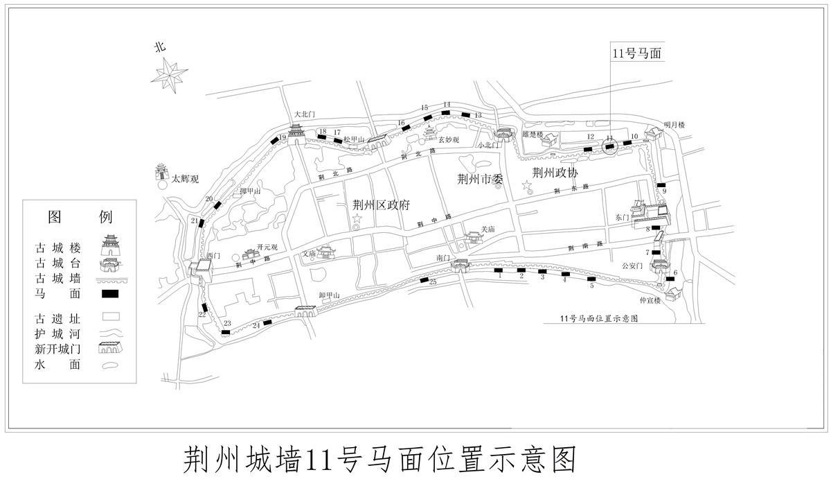 荆州城墙位于湖北省荆州市荆州区,现存城墙平面为不规则长方形,周长11.28公里,城内东西长约3.75公里,南北宽约1.2公里,面积4.5平方公里。1956年11月公布为省级文物保护单位,1996年11月公布为全国重点文物保护单位。荆州城墙11号马面位于北城墙东段,明月楼遗址与远安门之间。