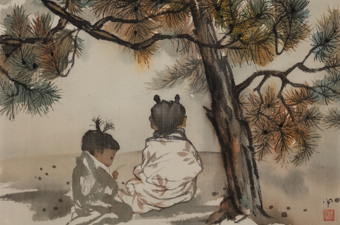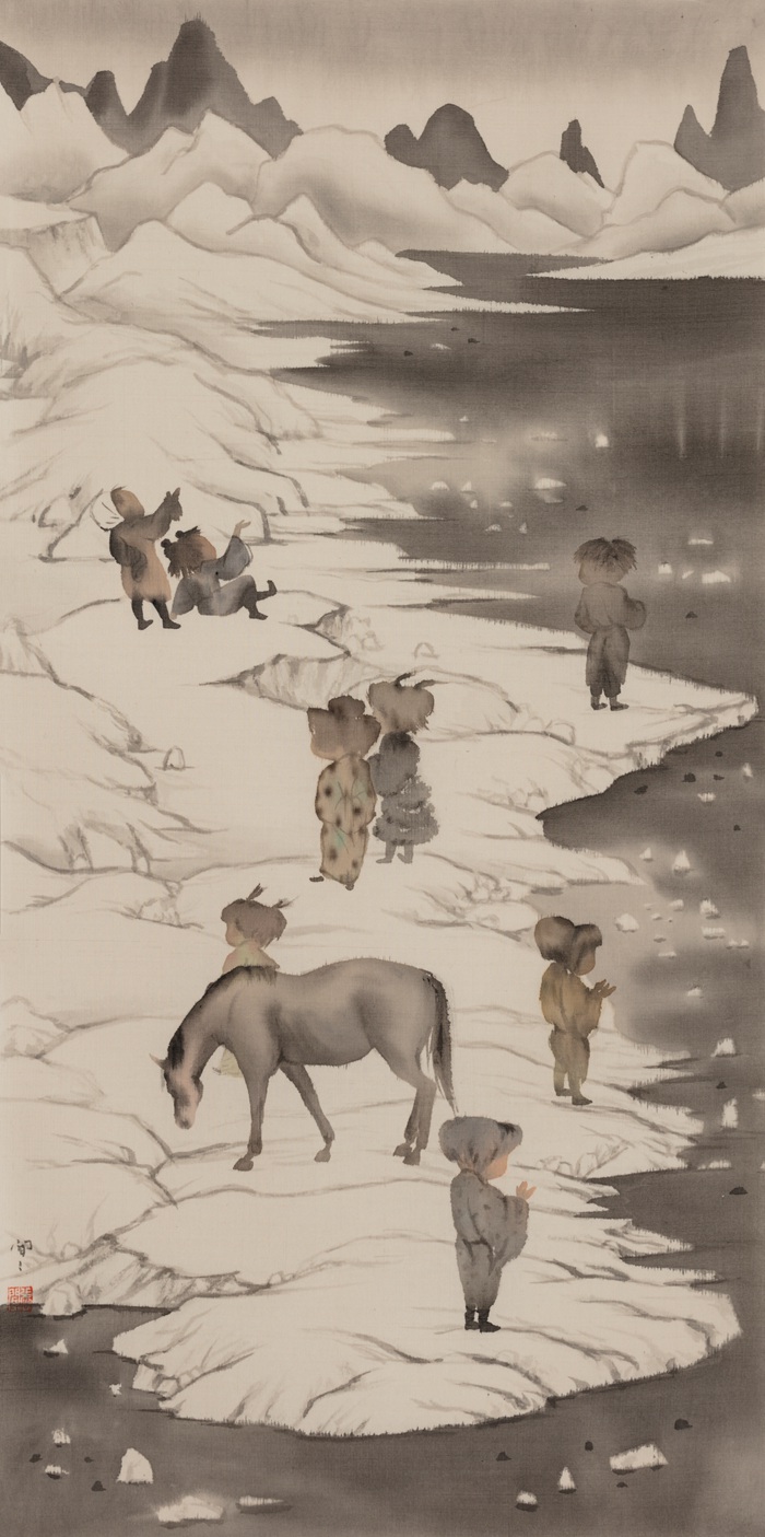 我注意到,虽然与她的老师一样,其作品多以“小儿”作为画面的主体,但表达的意趣以及手法却很有个人特点。具体说来,画中的“小儿”或独处、或结伴而行——且常常游戏于山林大水之间。按我的理解,她在很大程度上是希望借助于近乎寓言的方式强调一种神秘如梦的象征性图境,从而在精神层面追求一种比现实更为理想、更为人性、更为惬意的生存方式。