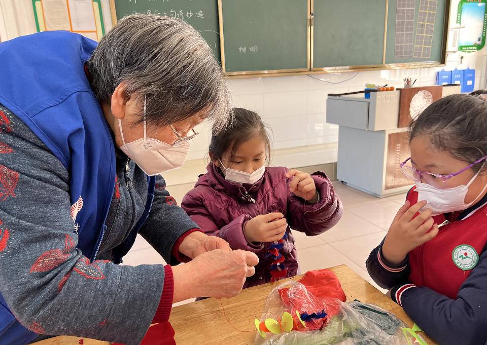 “先把小穗子系在线的尾部,接下来我们就可以穿龙尾啦。”林乐英大姨一边手把手地教孩子们穿针引线一边对孩子们说道。
