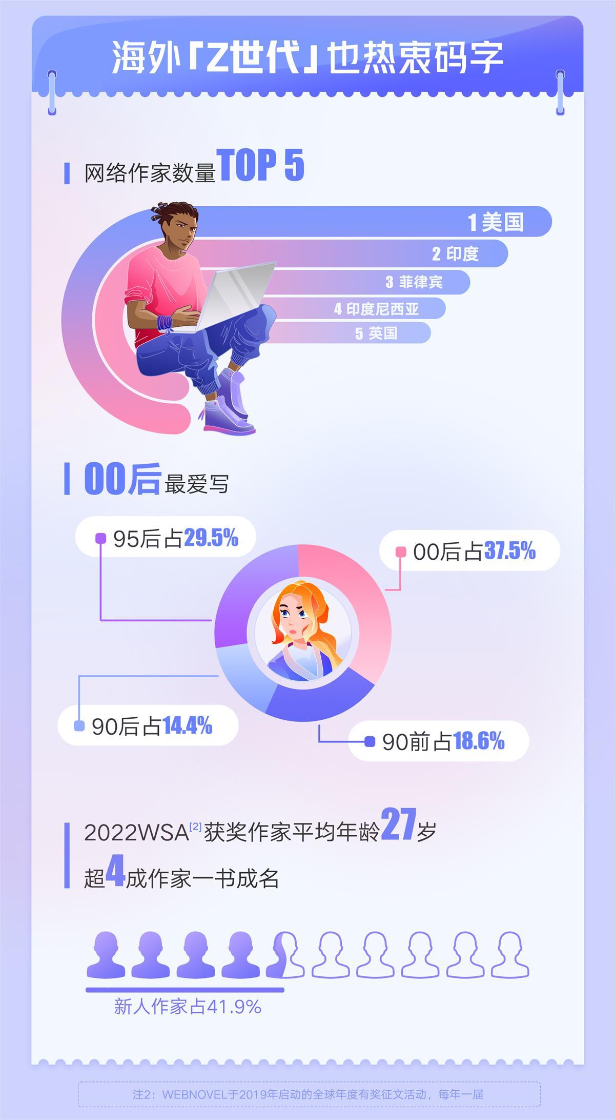 年轻人已成海外网文创作的中坚力量。在起点国际,00后作家占比高达37.5%,其次为95后,占比为29.5%,Z世代合计占比超三分之二。年轻作家“一书成名”屡见不鲜,2022WSA获奖者的平均年龄只有27岁,超四成作家是首次公开发表小说。