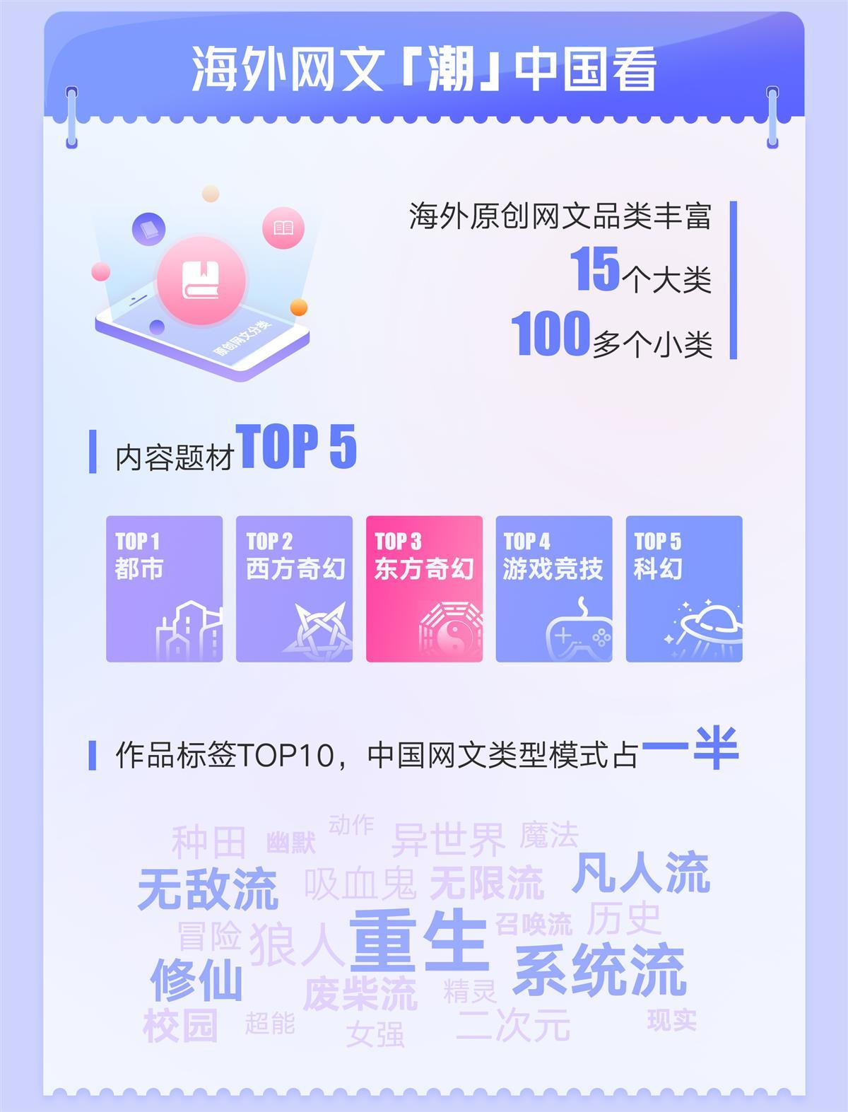 伴随着海外网络作家的快速成长,海外网络文学呈现出百花齐放的原创生态,已形成15个大类100多个小类,都市、西方奇幻、东方奇幻、游戏竞技、科幻成为前五大题材类型。与此同时,海外网络作家还深受中国网文类型创作的影响。在排名前十的原创作品标签中,不乏“重生”“系统流”“凡人流”“修仙”“无敌流”等典型的中国网文类型模式。
