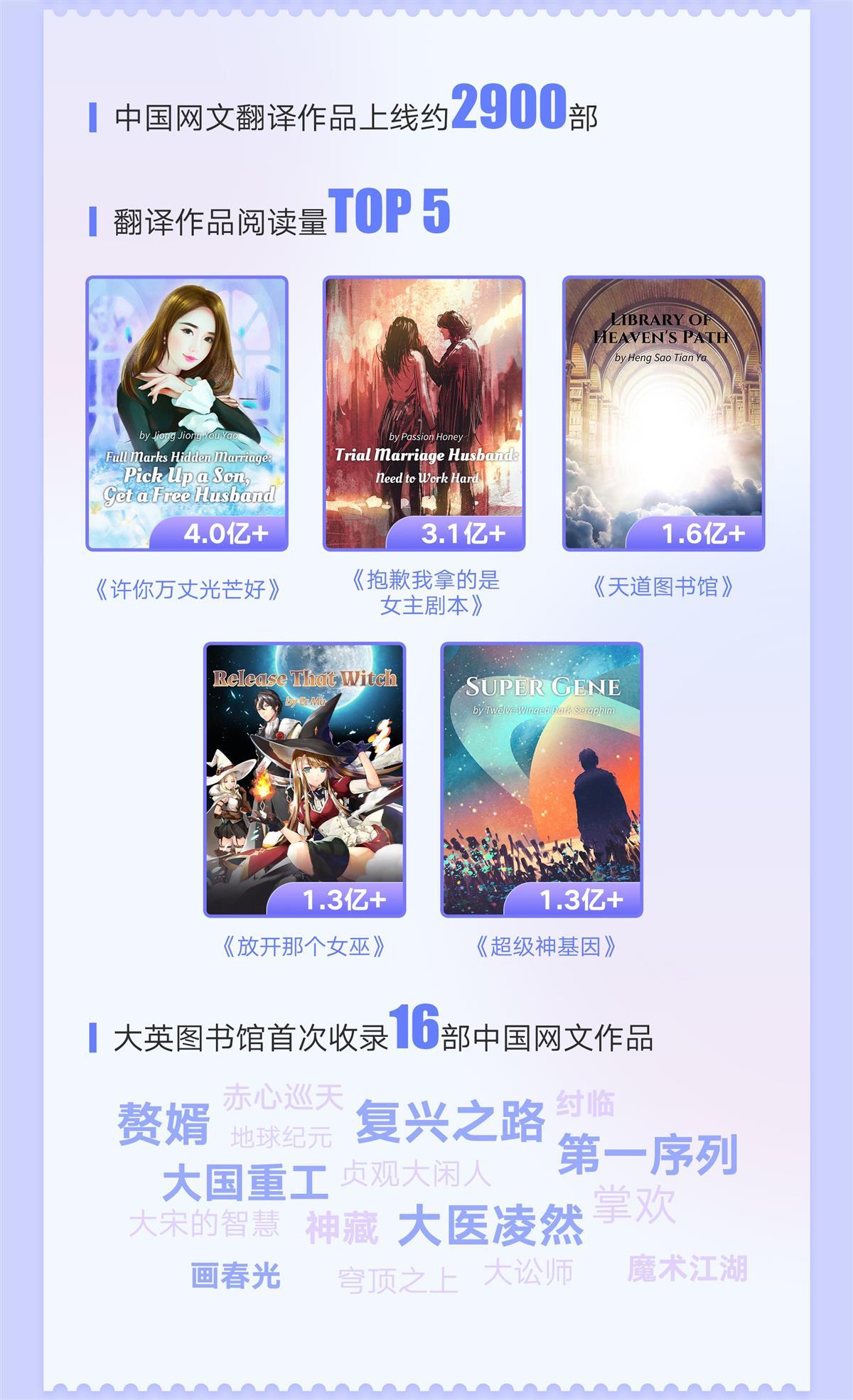 在起点国际,2900余部中国网文的翻译作品囊括了仙侠、奇幻、都市、科幻等多元类型,内容丰富多样。截至2022年底,已有9部中国网文的翻译作品阅读量破亿,刻画当代女性自强不息破茧成蝶的《许你万丈光芒好》阅读量突破4亿,高居榜首。