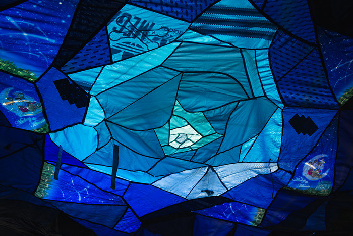 乐思洋:这届展会上有很多的亮点作品,从我个人角度可以与你分享的是其中展区“艺聚空间”的两位香港艺术家,一位是杨沛坚,一位是林岚。杨沛坚的作品叫做《屋檐下的拥抱先生》,这件作品本来要在乌克兰首展,由于大家都知道的原因没能成行,我们把它带到了今年的展会现场。另一位是林岚,她本身是香港艺术学院的老师,她今年带来了一件14米长的用布料做成的大型装置。这件作品非常的惊艳,可以让你在很繁忙喧闹的展场上寻找到一片宁静的感觉。