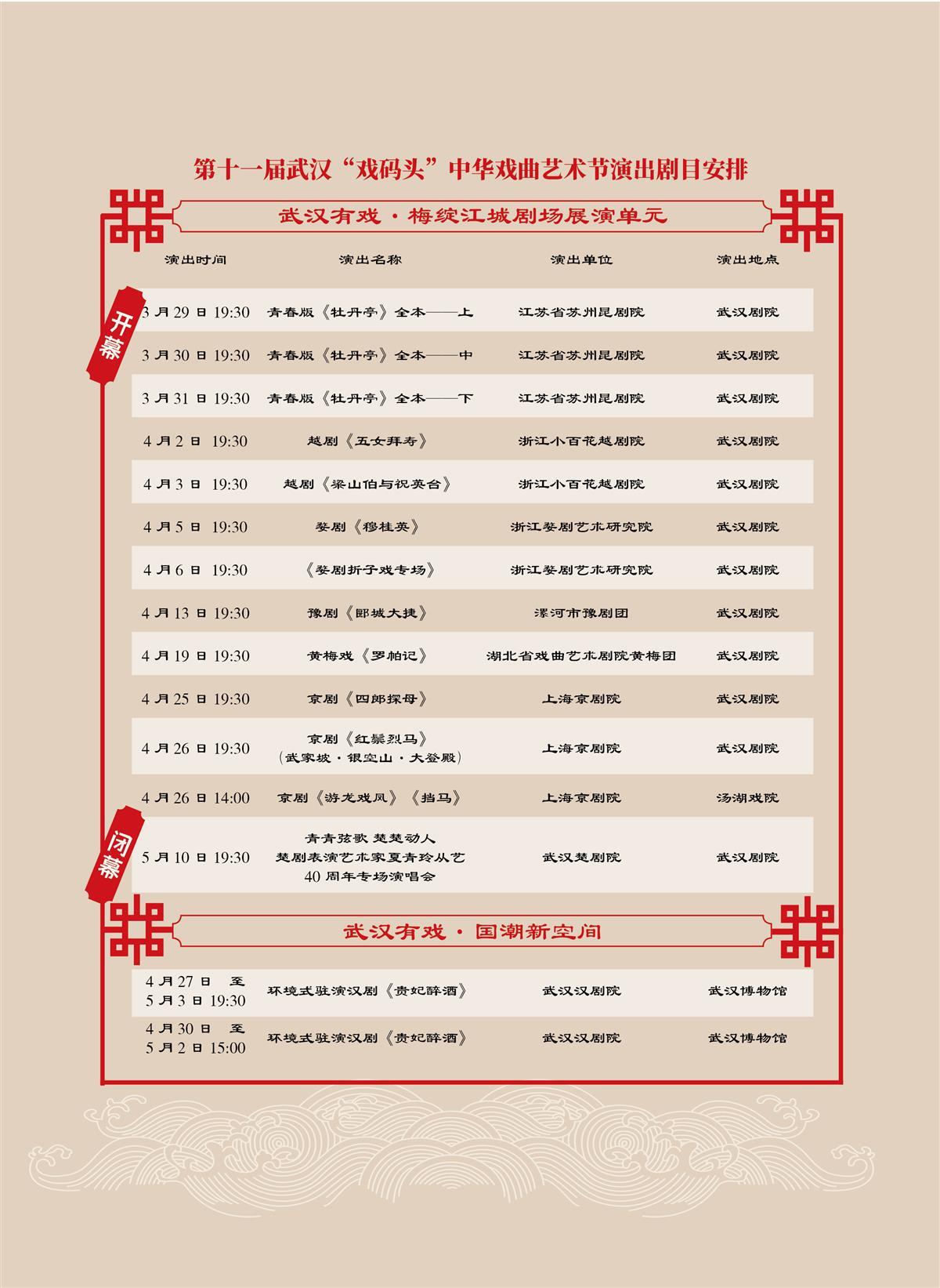在苏州昆剧院将连续三天献演青春版《牡丹亭》全本外,京剧《红鬃烈马》、越剧《五女拜寿》、婺剧《穆桂英》等常演不衰的经典热门戏曲剧目也会在张慧芳等“梅花奖”得主的加持下,陆续唱响武汉戏曲“大码头”的最强音。