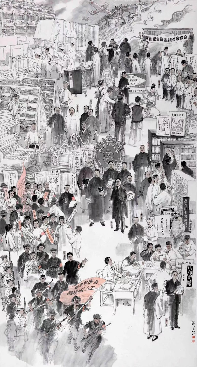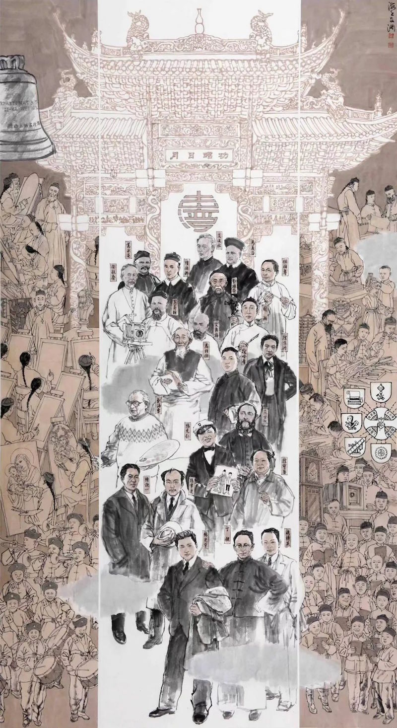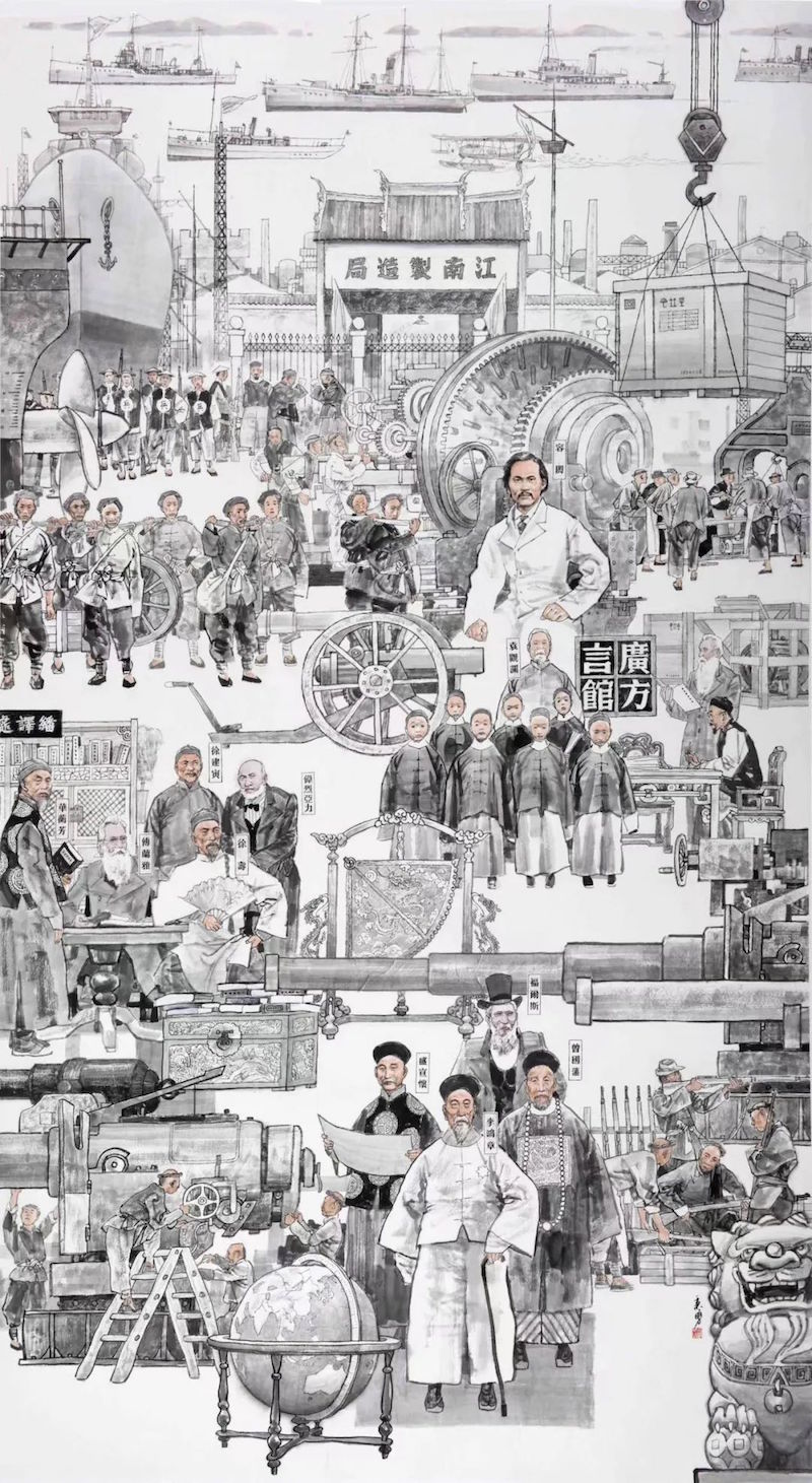 展厅中,画家叶雄的作品《上海滩开埠》用滨江、城墙大视野进行历史回眸,见证了布告上墙、领事出任、百姓相告、东西交汇,舟楫闪现,风尚变异……;画家忻秉勇的作品《江南制造局》则展现了江南制造局在民族工业方面的庄严起步,在翻译领域的重大贡献,对于城市科学精神的悉心养育。在忻秉勇笔下,他描绘了曾国藩、李鸿章等与江南制造局相关的历史人物形象;画家奚文渊的作品《土山湾》和《商务印书馆》则展现了吹入城市文化、科技、经济、社会互动的新风,展现西学东渐,风潮涌动。其中,对于《商务印书馆》的描绘更是包含了抗战时期的艰辛之路。